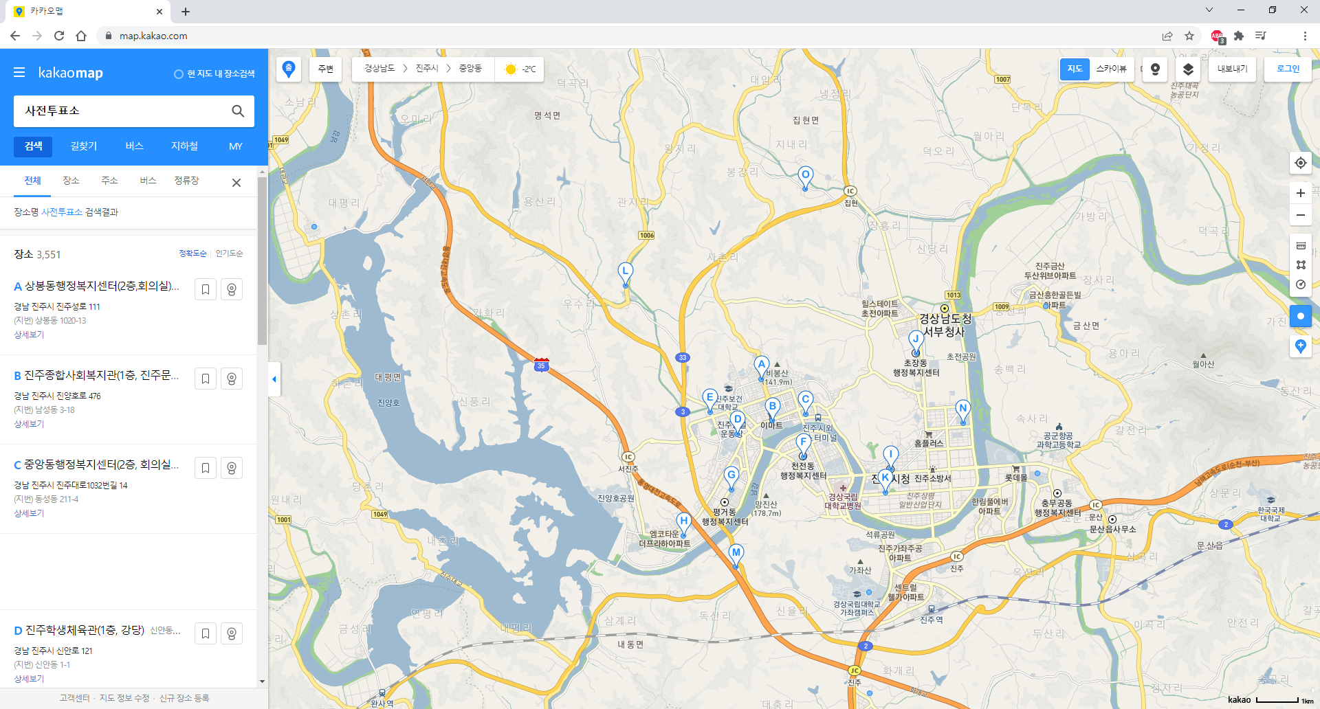 2. 예시는 제가 현재 거주하는 도시인 경상남도 진주시를 예시로 하였으며 지도에 사전투표소 위치가 뜨게 됩니다. 위 팝업창이 없는 경우에는 검색창에 사전투표소를 검색하거나 위의 선택 칸에 사전투표소를 선택하시면 바로 검색이 가능합니다.