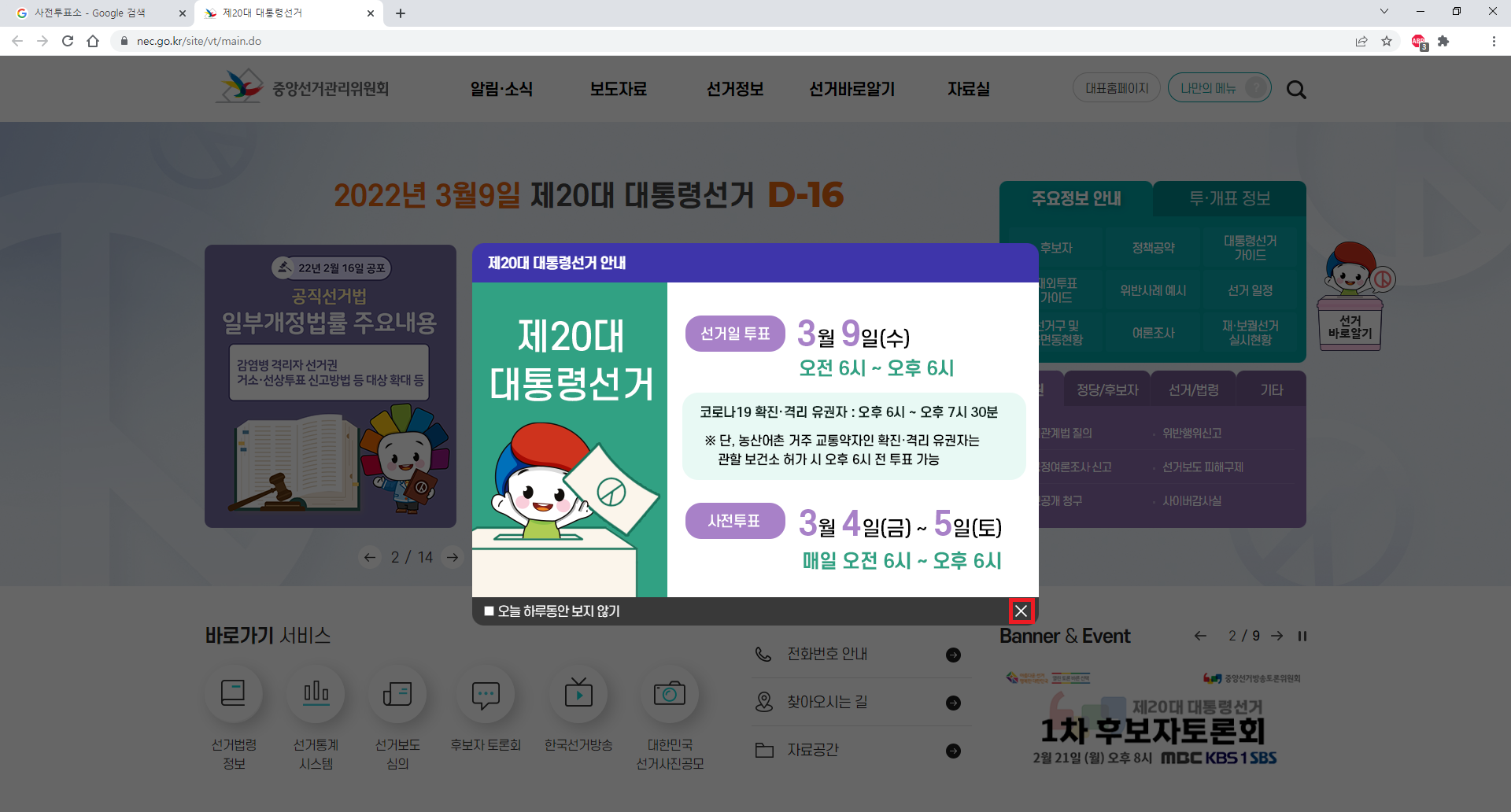 2. 중앙선거관리위원회 홈페이지로 이동한 다음 팝업창은 꺼 줍니다.