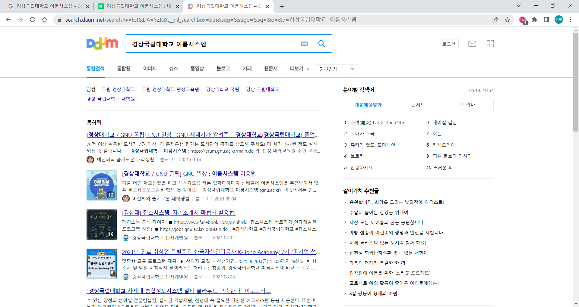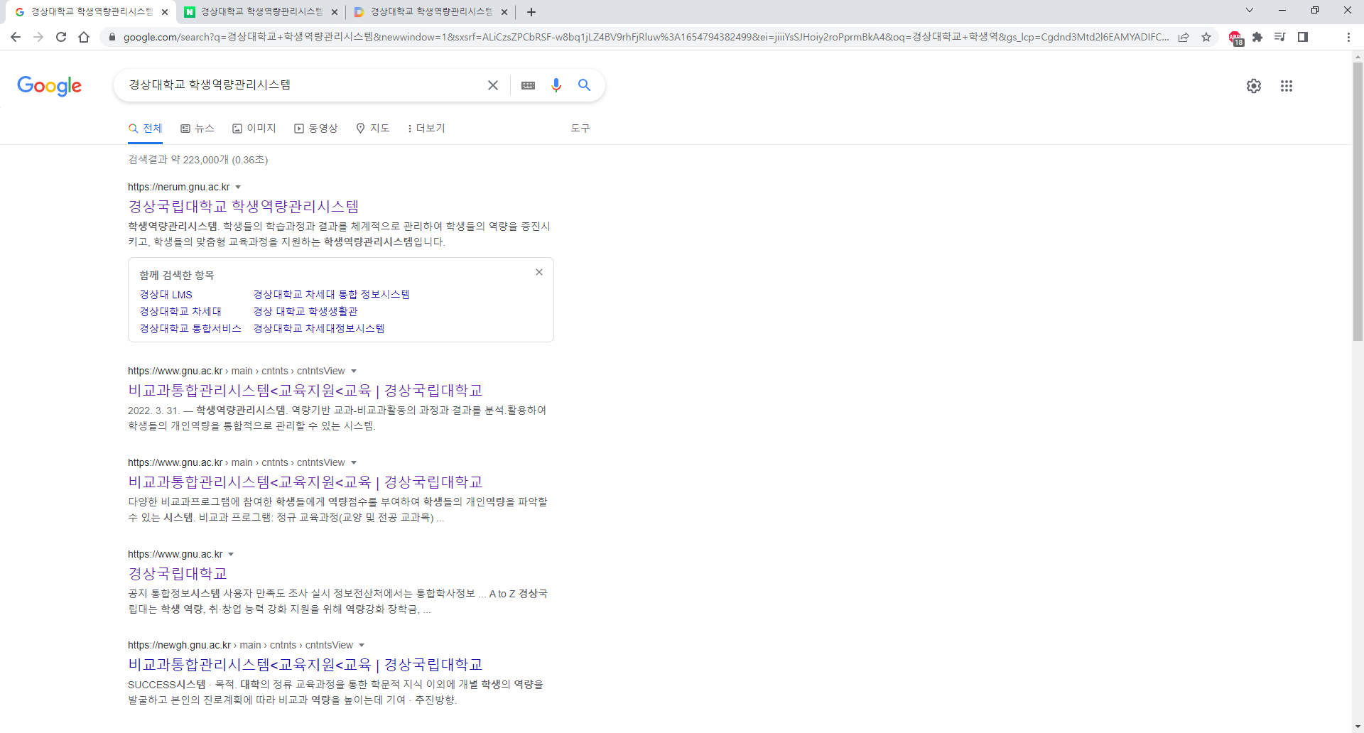 작성일인 2022년 6월 10일 기준으로 구글이나 네이버, 다음에서 검색한 경우 위와 같은 검색 결과를 얻을 수 있으며 경상대학교 이룸시스템 혹은 경상국립대학교 이룸시스템으로 검색해도 구 이룸시스템으로만 연결시켜 주게 됩니다. 그리고 다음의 경우에는 사이트 연결을 해주지 않습니다.