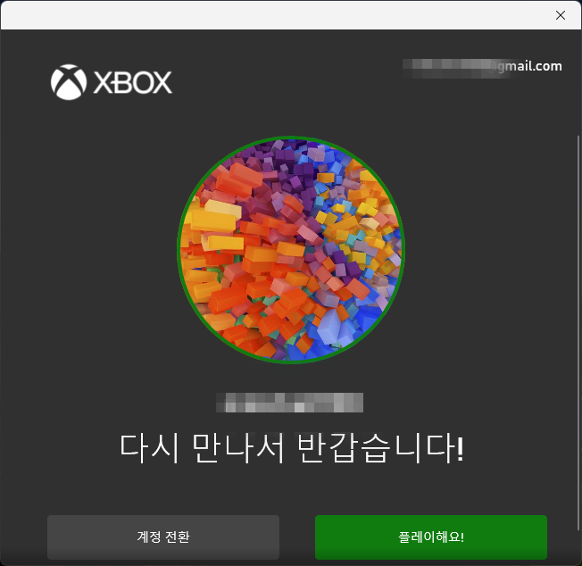 12. XBOX 로그인을 하면 사용자 프로필이 나오며 맞는지 확인하고 맞다면 녹색 '플레이해요!' 버튼을 눌러 진행합니다.