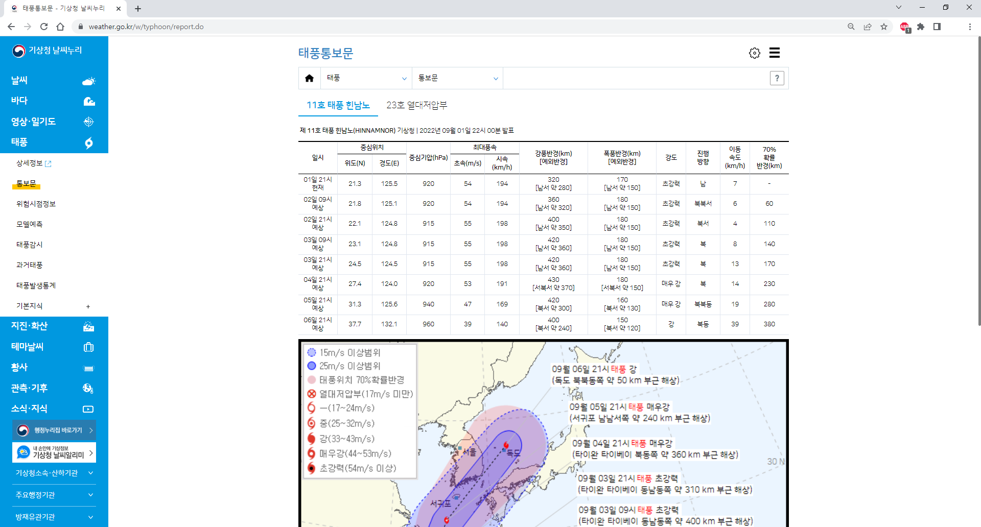 자세한 정보를 얻으려면 왼쪽 태풍 탭에 통보문 혹은 상세정보를 눌러도 됩니다.