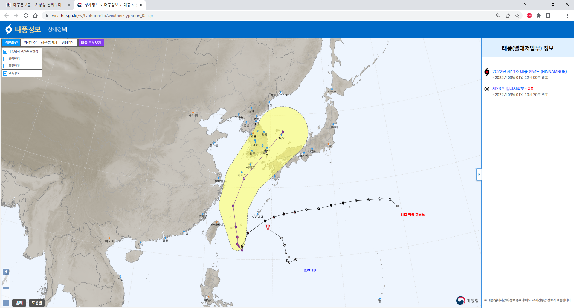 현재 태풍 관련 예보를 찾을 때 저는 여러 사이트를 확인해보며 언제 가장 위험할지 찾아보고는 합니다.