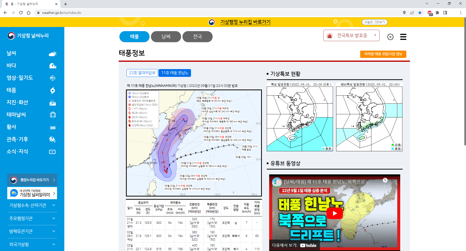 기상청의 경우에는 태풍이 한반도 근처에 올 것으로 예상되면 위와 같이 태풍 정보를 메인 홈페이지에 띄우게 됩니다.