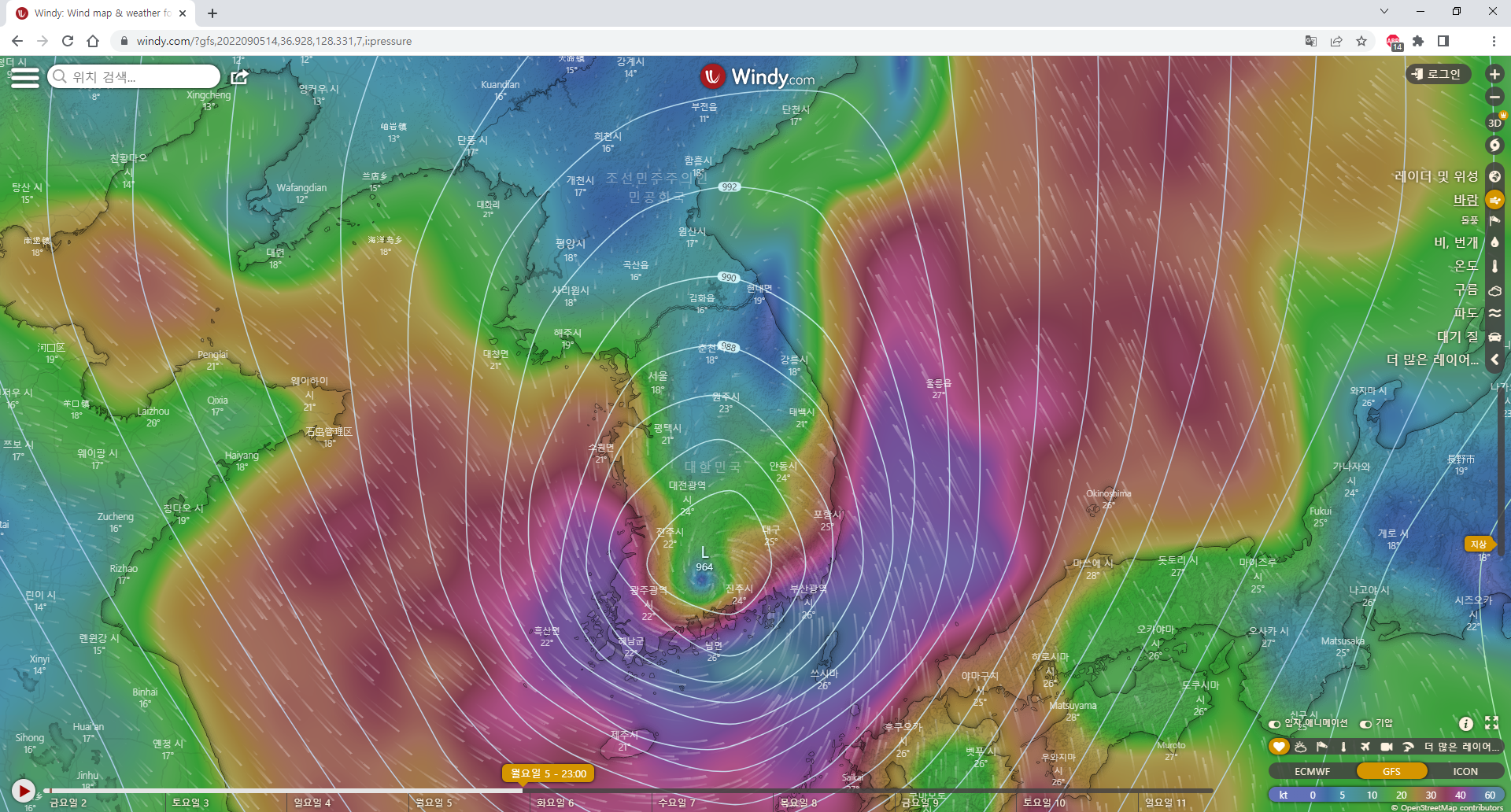 그 이외에 Windy에서는 ECMWF 또는 GFS 모델 예측을 통해 며칠정도의 날씨 예보를 볼 수 있어 한번씩 확인해 보는 것도 괜찮습니다.