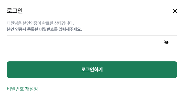 본인인증이 되어있는 경우 비밀번호를 입력하면 되고 본인인증이 안되어 있다면 본인인증과 비밀번호 등록 후 진행하면 됩니다. 비밀번호는 대문자, 소문자, 숫자, 특수문자가 모두 있어야 됩니다. 여기서 비밀번호는 나중에 다시 듣는 경우 사용됩니다.