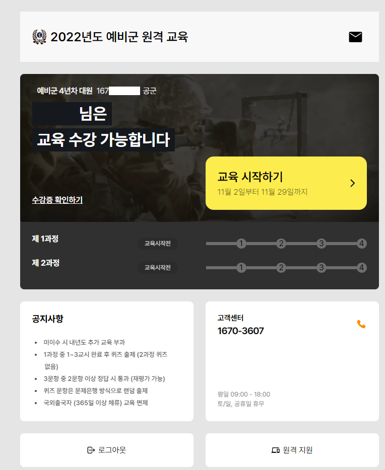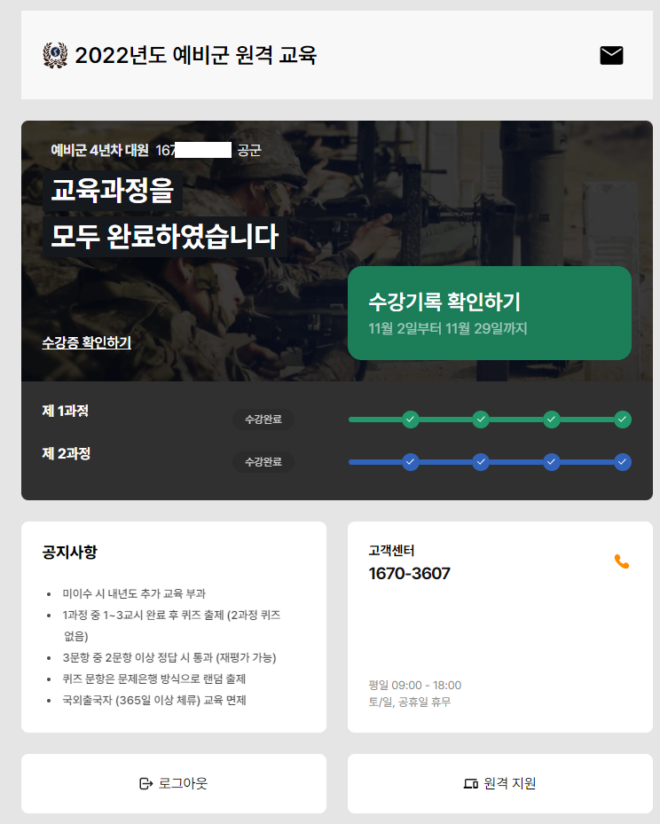 예비군 원격교육 메인 화면에서 안내가 되고 있으니 이 또한 참조하시면 됩니다.