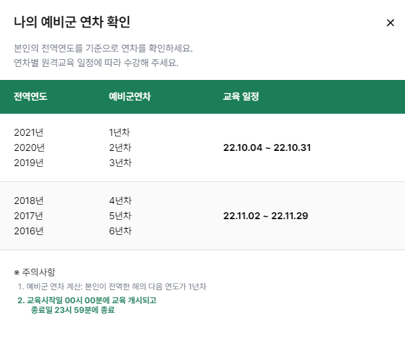 참고로 현재(2022년) 기준으로 예비군 연차는 다음과 같습니다. 해당 기간은 전역한 날을 의미합니다.