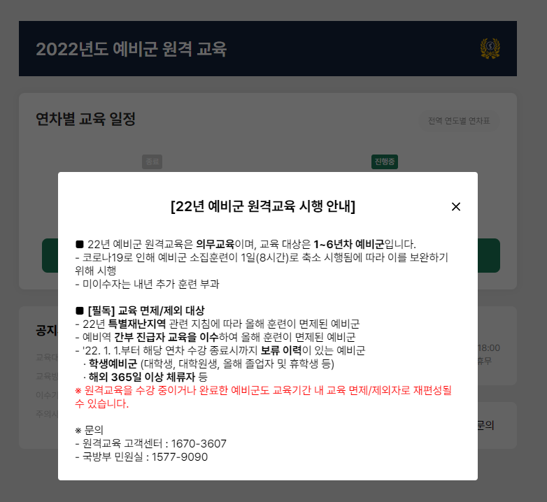 예비군 원격교육 사이트에 들어가면 시행 안내문이 나오며 훈련 면제나 보류 이력이 있는 경우에는 교육 면제가 됩니다. 오른쪽 위의 X 버튼을 눌러서 진행하면 됩니다.