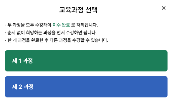 노란색 교육 시작 버튼을 눌렀다면 제1 과정, 제2 과정을 선택할 수 있으며 눌러서 진행하면 됩니다.
