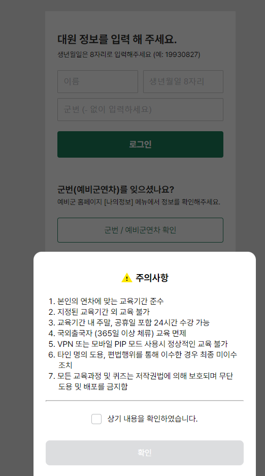 녹색 교육 시작 버튼을 눌러서 진행하면 주의사항 안내문이 뜨게 됩니다. 여기서 내용 확인하고 '상기 내용을 확인하였습니다.'에 체크를 한 뒤 확인 버튼이 활성화되면 눌러서 진행합니다.