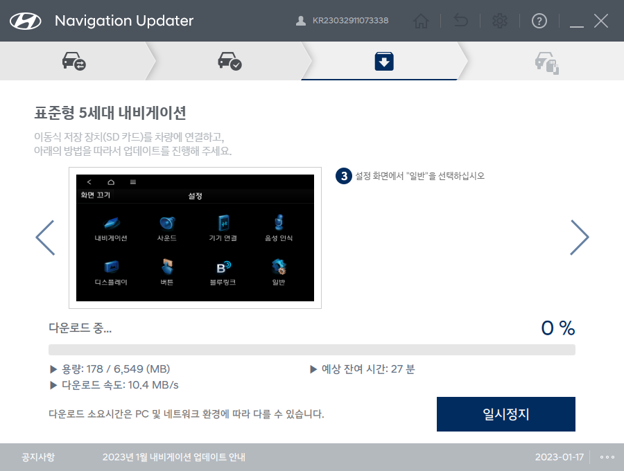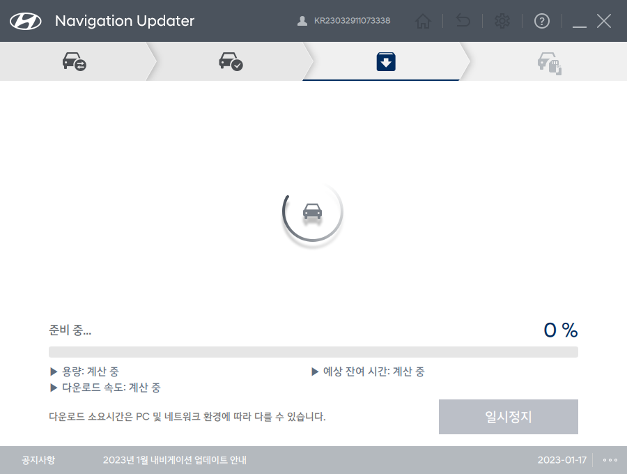 누르면 위와 같은 화면으로 진행되며 위 부분은 진행상황을 표시하기도 하지만 하나의 버튼이므로 빨간색 상자 안의 Navigation Updater 다운로드를 눌러서 진행합니다.