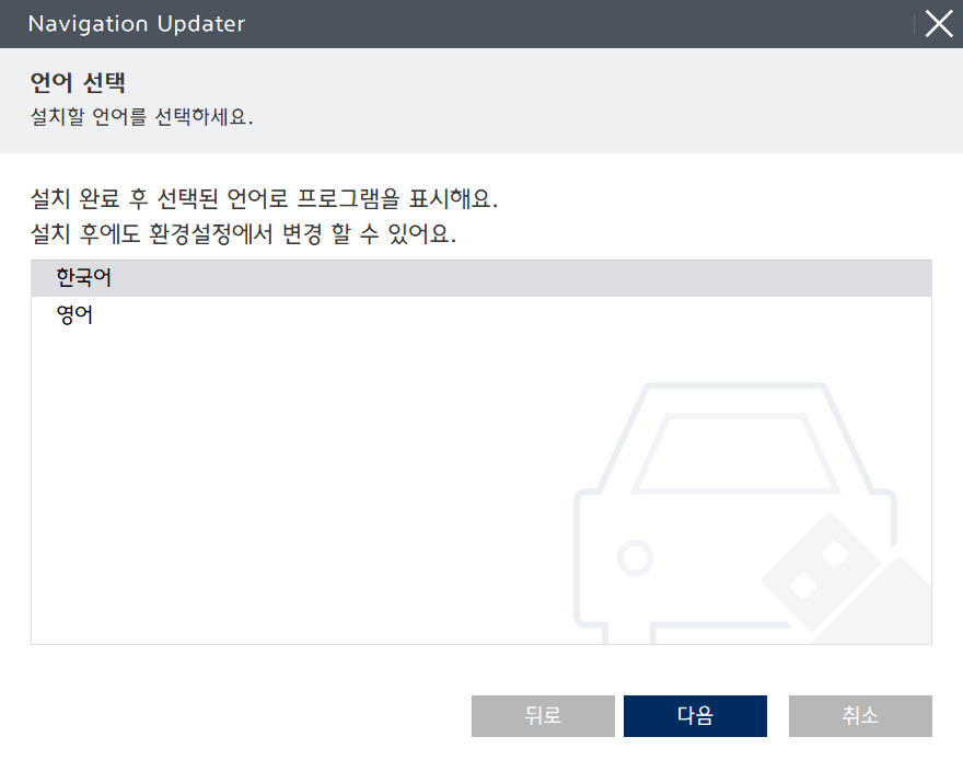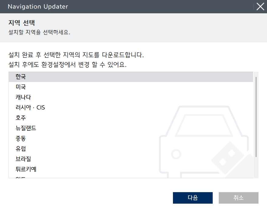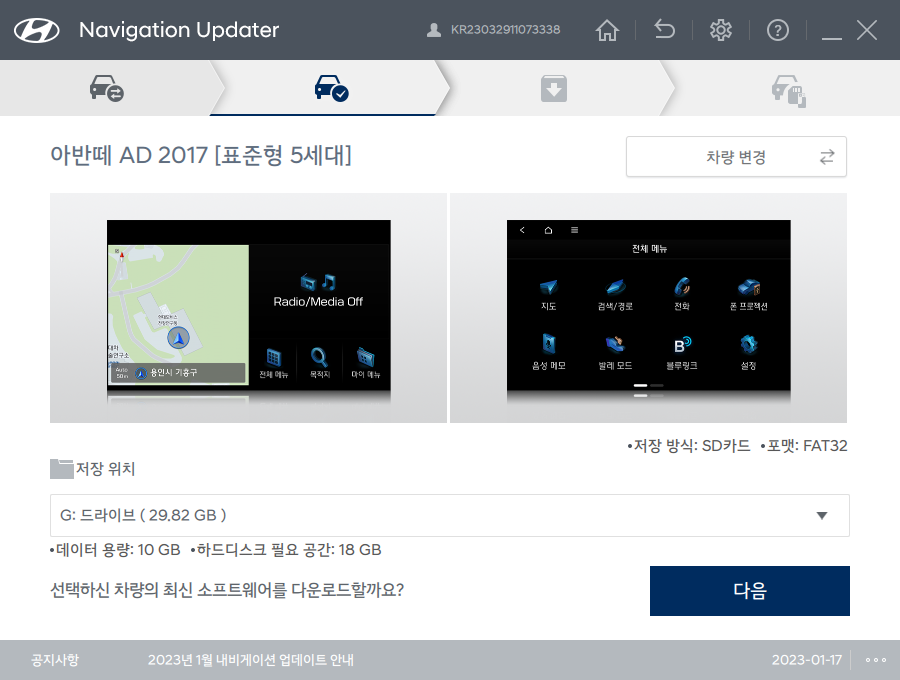 인식이 되어 있다면 자동으로 내비게이션이 선택이 되며 업데이트 여부를 물어봅니다. 오른쪽 아래의 파란색 다음 버튼을 눌러 진행합니다.