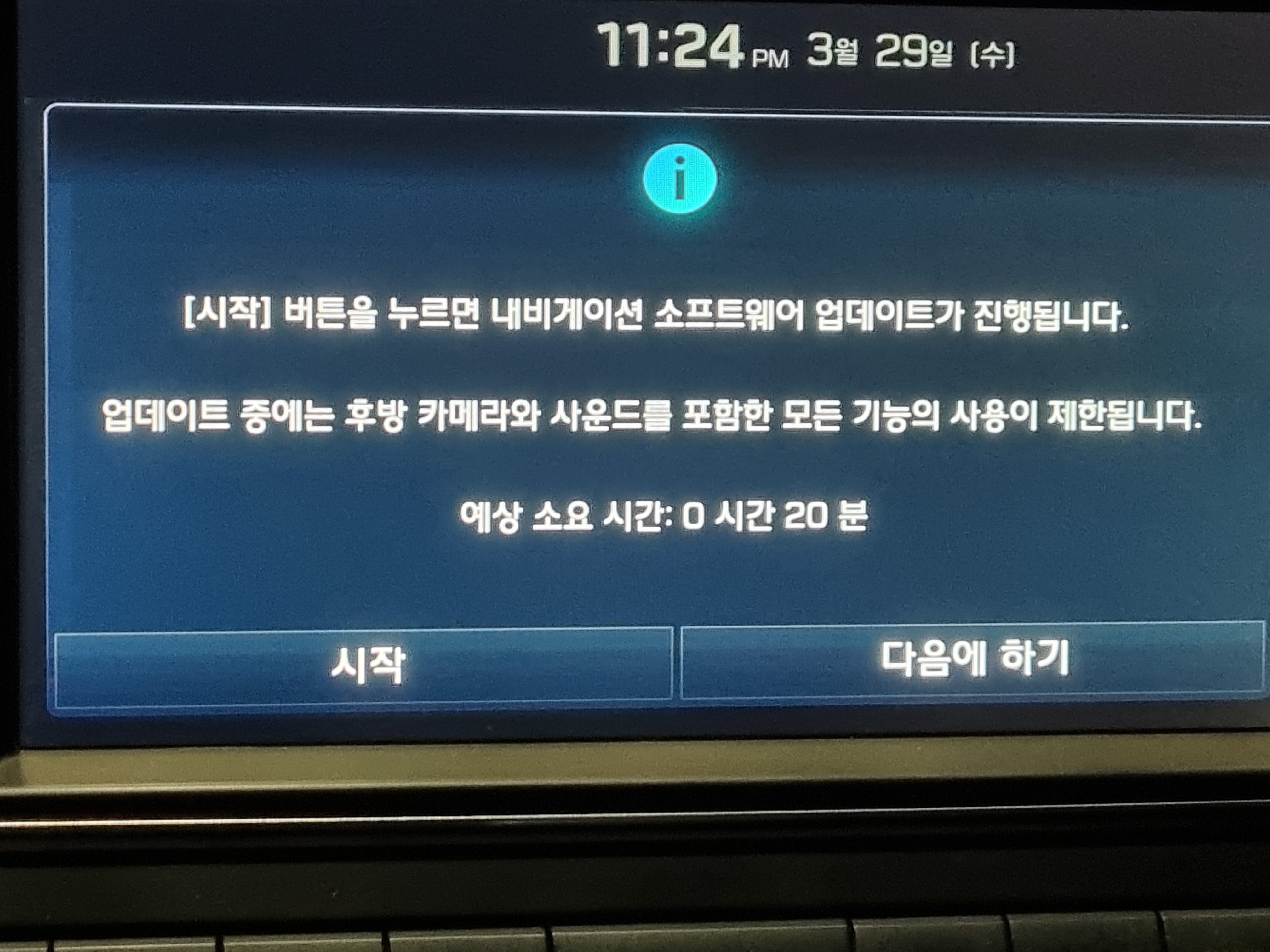 다시 안내 메시지가 나오는데 업데이트 도중에는 사용이 제한된다는 내용이므로 시작 버튼을 눌러 진행합니다.