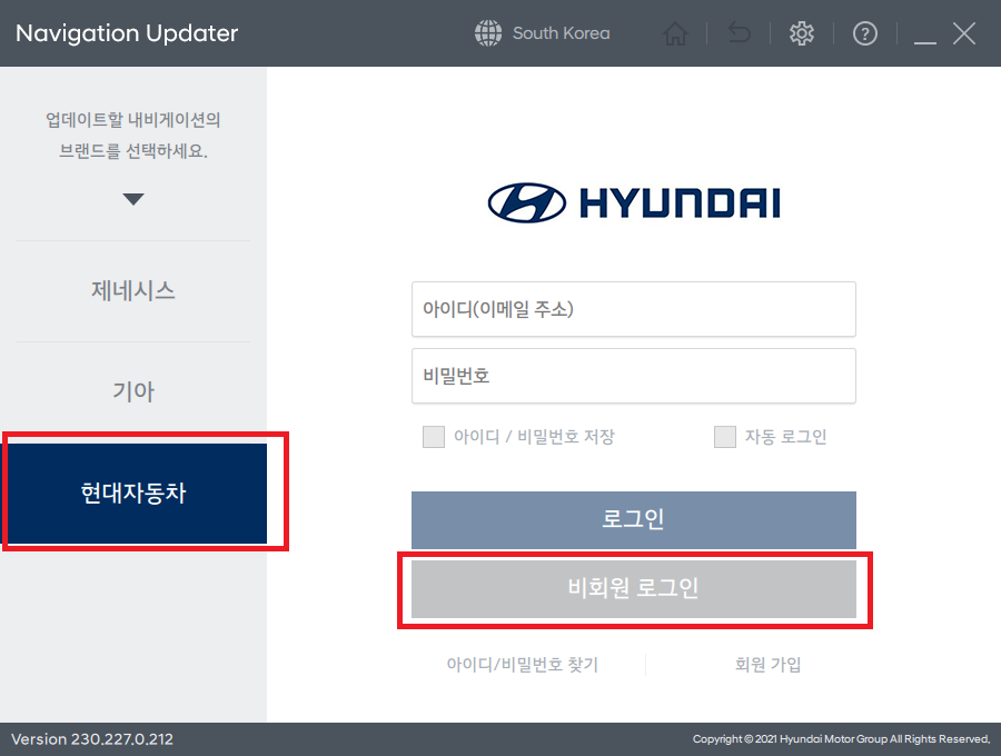 처음 켜지는 경우 제네시스가 선택되어 있으며 로그인 화면이 뜨게 되는데 왼쪽 현대자동차 버튼을 누른 다음 아래 부분의 회색 비회원 로그인 버튼을 눌러서 진행합니다.