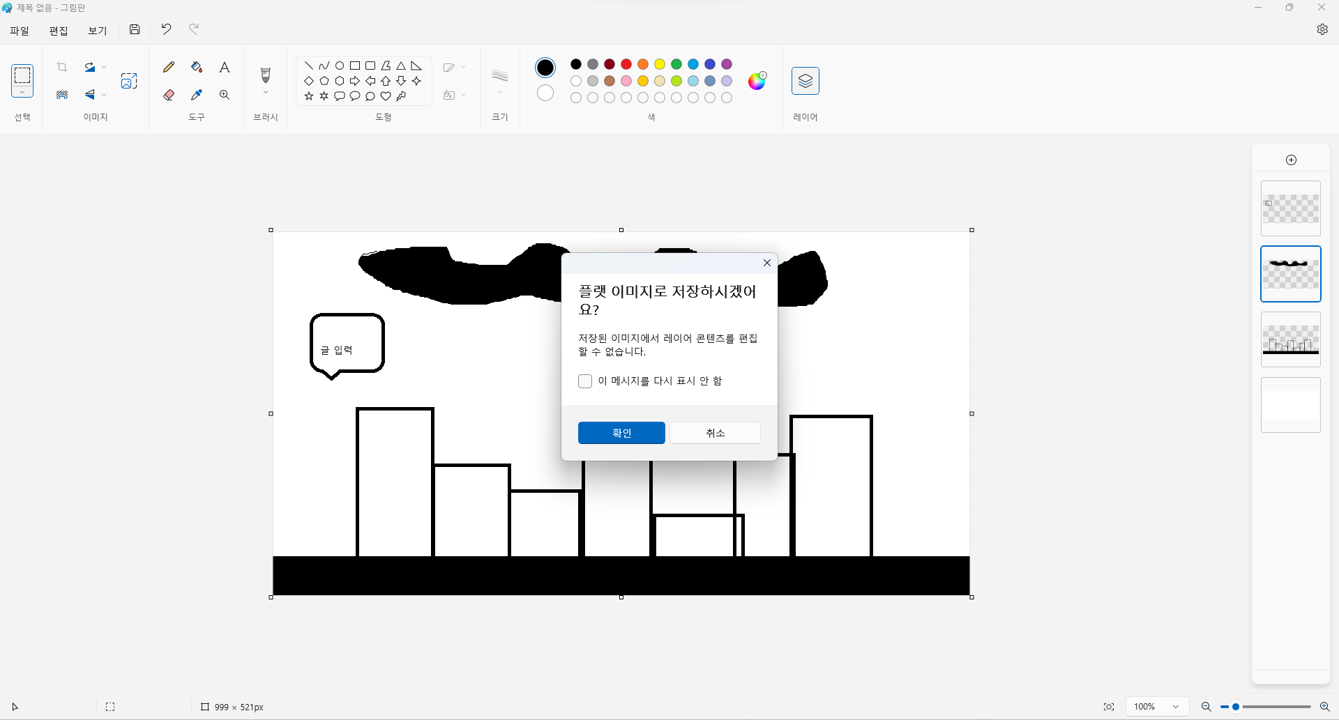저장을 하면 레이어 기능이 사라져 다시 복구할 수 없다는 단점이 있습니다. 따라서 간단하게 작업할 때 사용이 가능하며 전문적으로 저장하며 사용은 하기 힘들다는 점이 있었습니다. 정말로 그런지 저장 후 다시 열어본 결과입니다.
