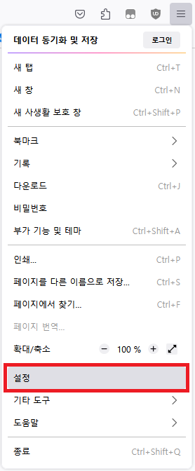 1. 파이어폭스도 마찬가지로 오른쪽 위 줄 세 개 버튼(햄버거 버튼)을 눌러 메뉴창을 활성화합니다.