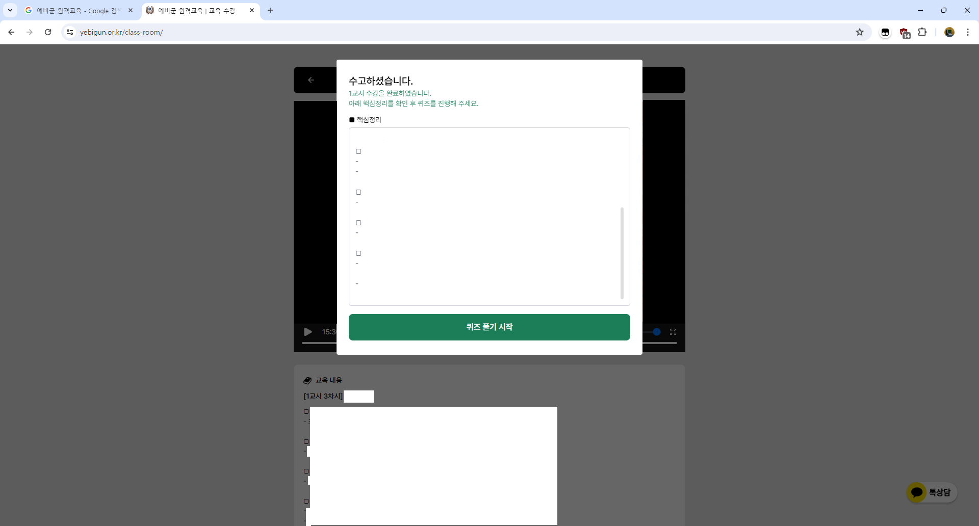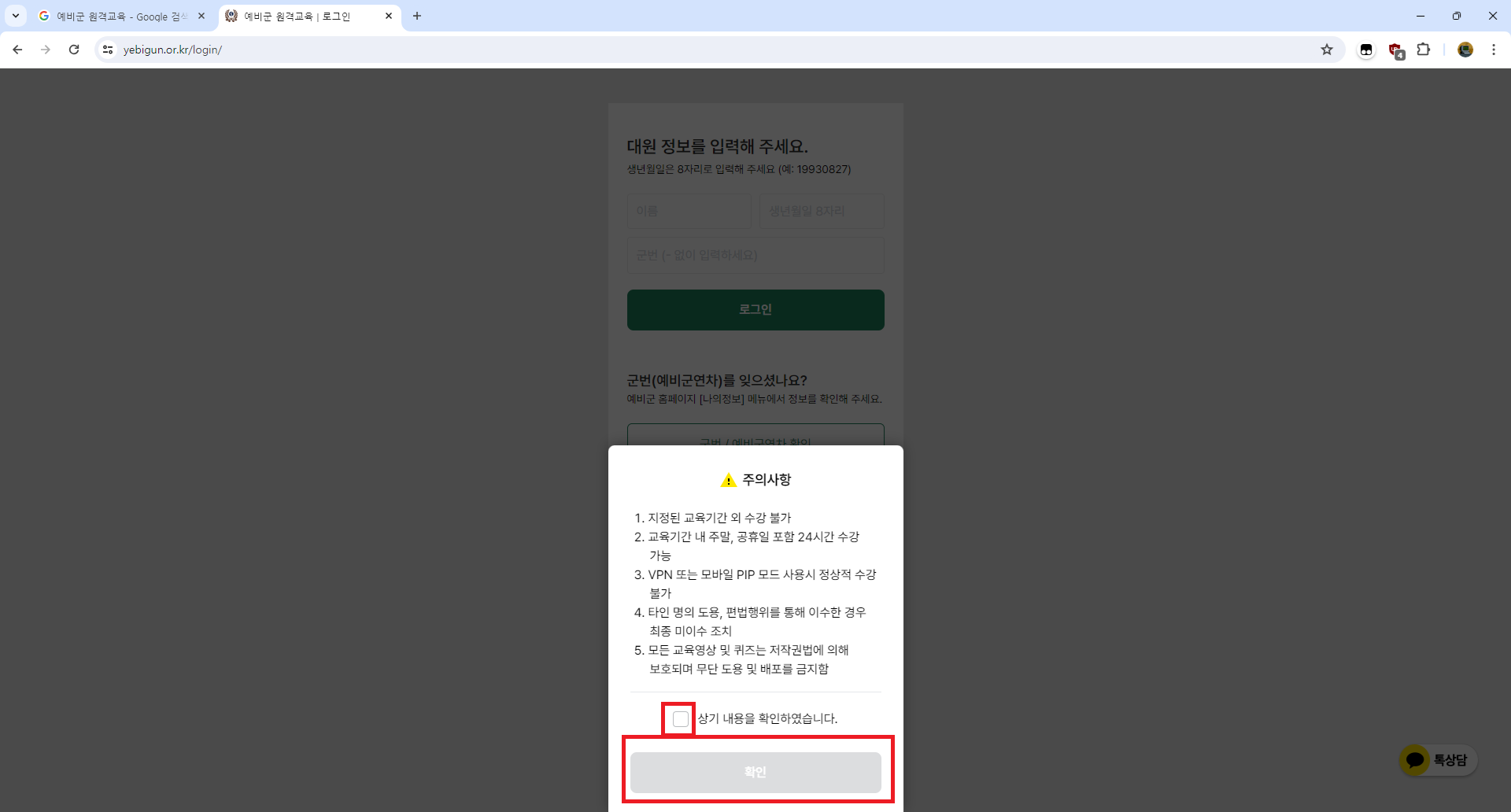 교육시작 버튼을 누르면 주의사항이 뜨며 확인 후 체크 표시 후 확인 버튼을 눌러 진행합니다.
