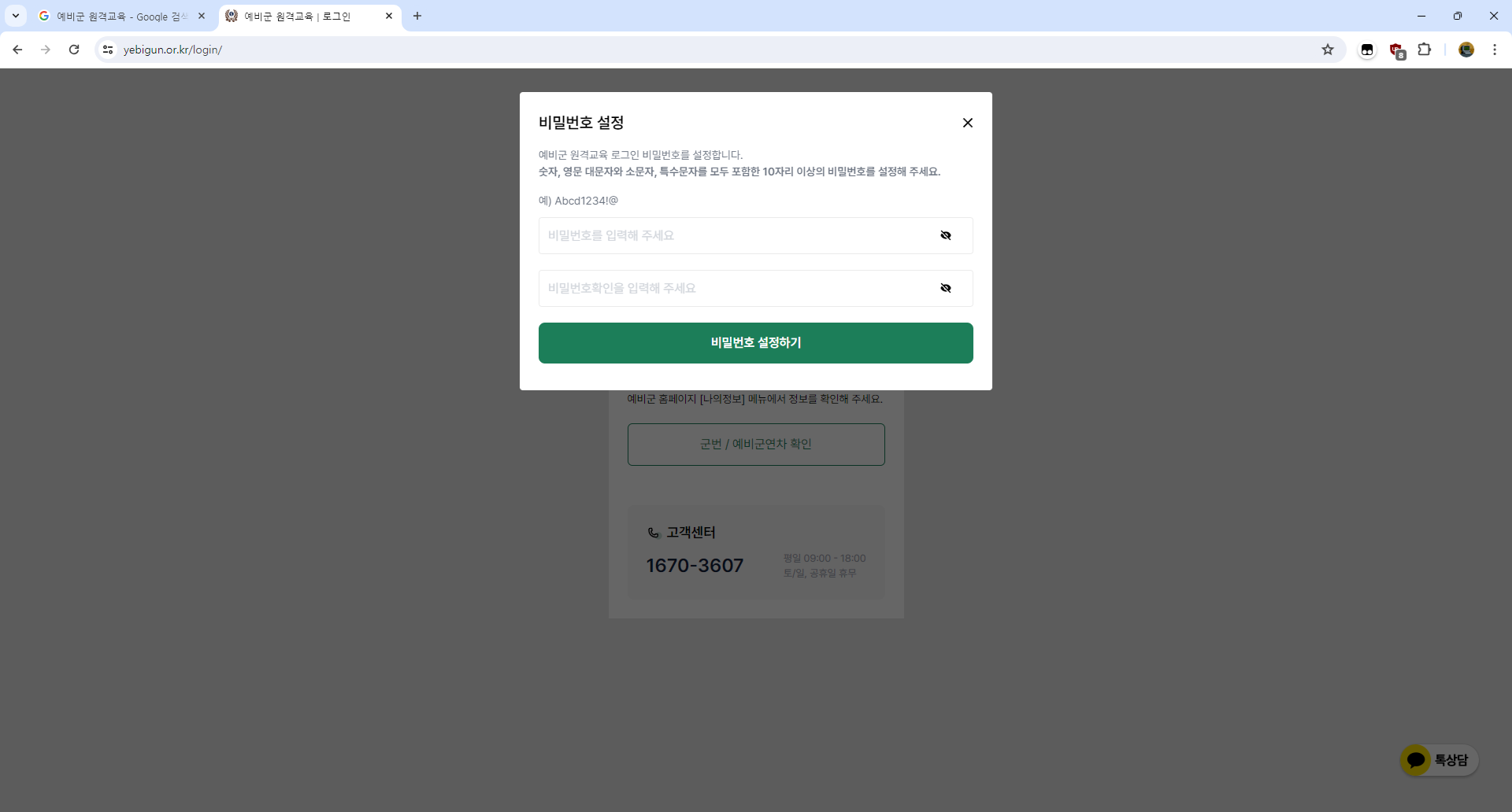 비밀번호는 영문 대문자, 소문자, 숫자, 특수문자 모두 포함하며 10자리 이상 입력해야 합니다. 이 비밀번호는 중간에 끊고 나중에 들을 때 필요하며 처음부터 끝까지 한 번에 수강하면 필요하지 않습니다.