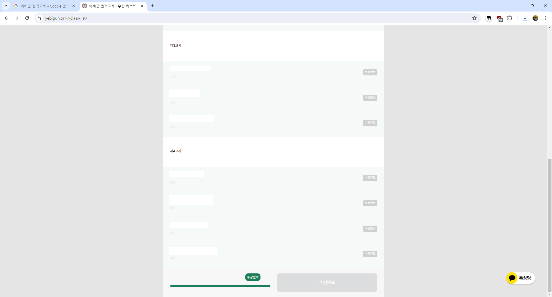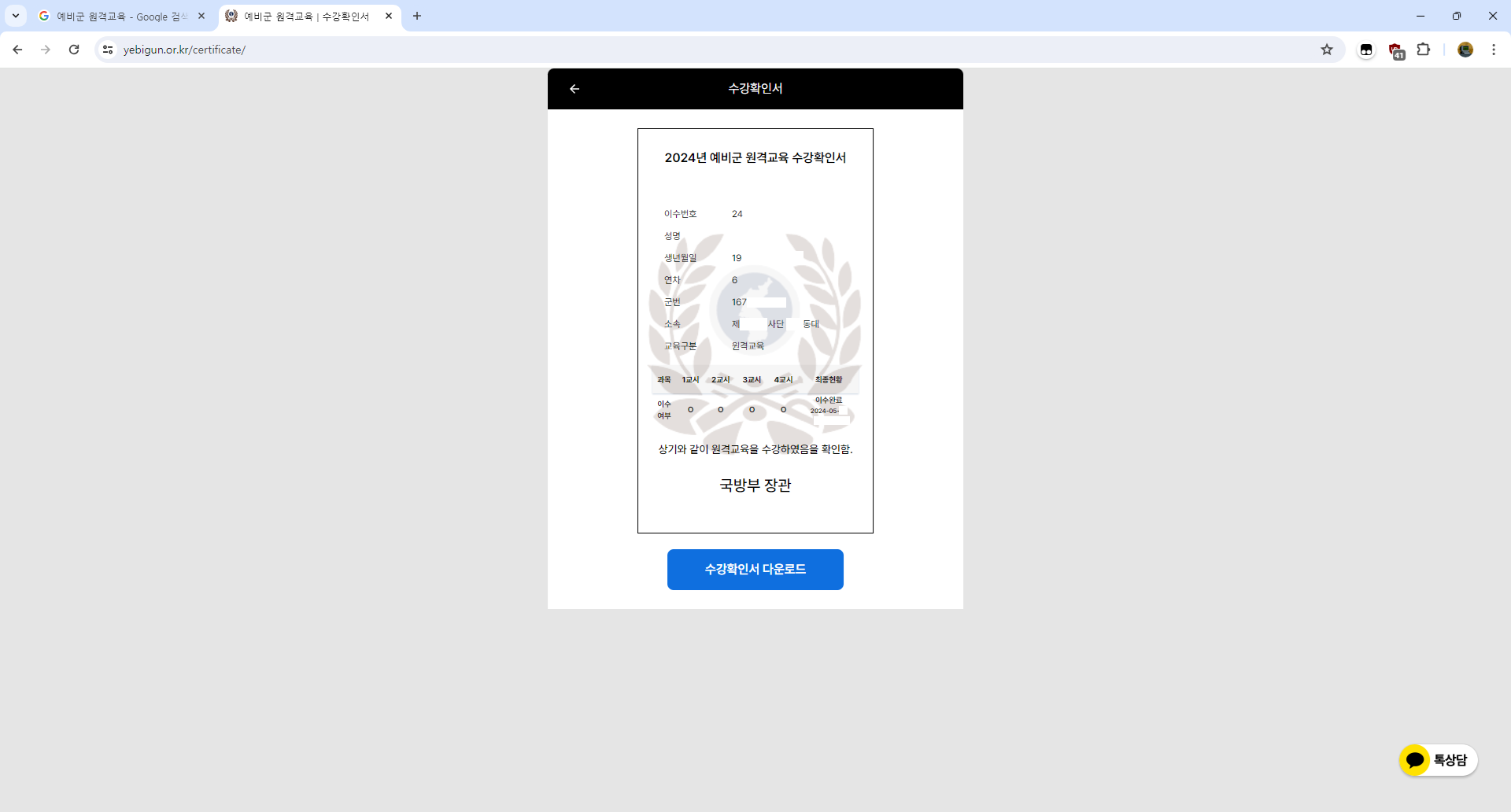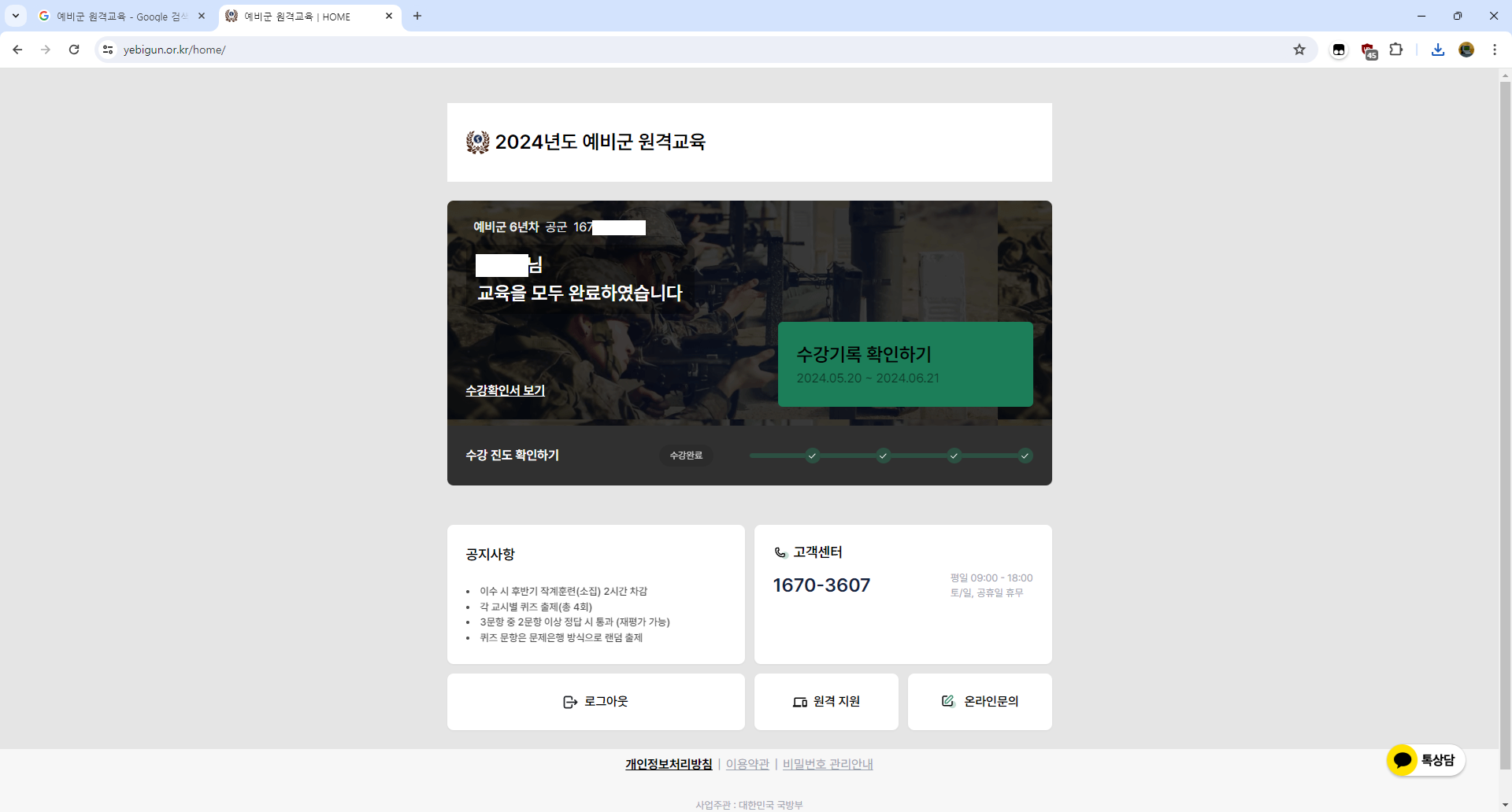 수강을 완료하여도 수강을 완료한 당일은 예비군 홈페이지에서는 확인할 수 없습니다. 그다음 날 오후쯤 되면 관련 내용이 업데이트되어 확인할 수 있게 됩니다.