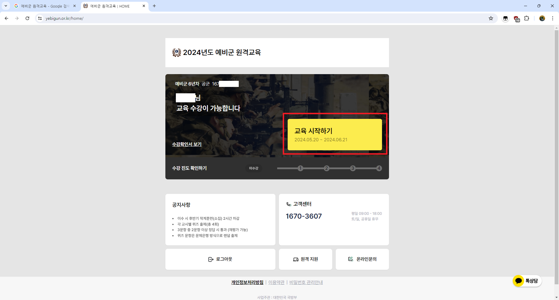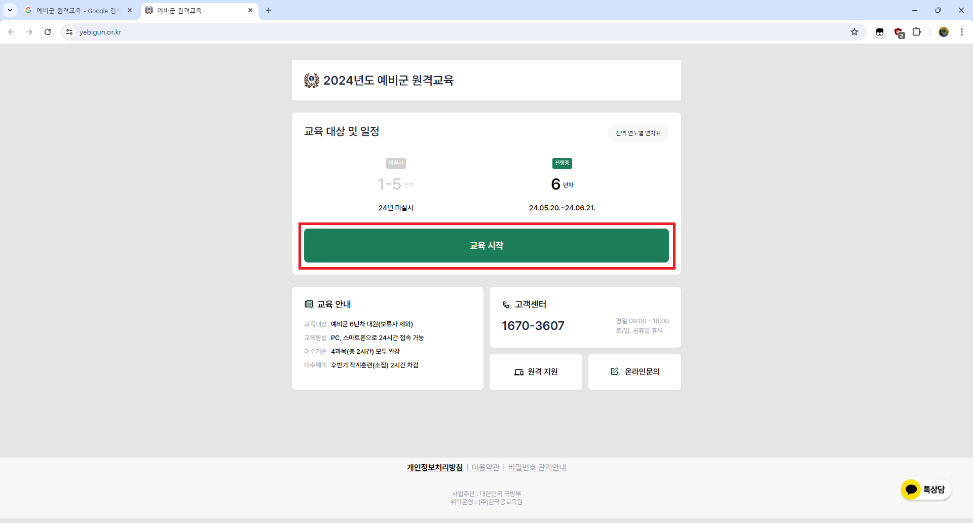 예비군 원격교육 홈페이지에 들어가면 녹색 교육시작 버튼을 선택하여 들어갑니다.