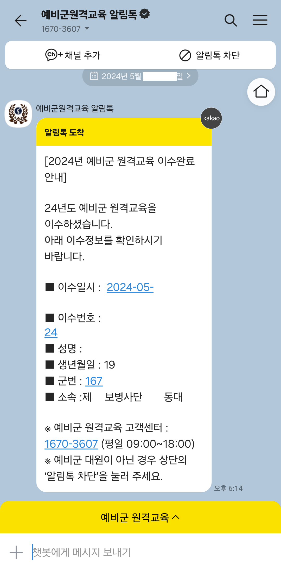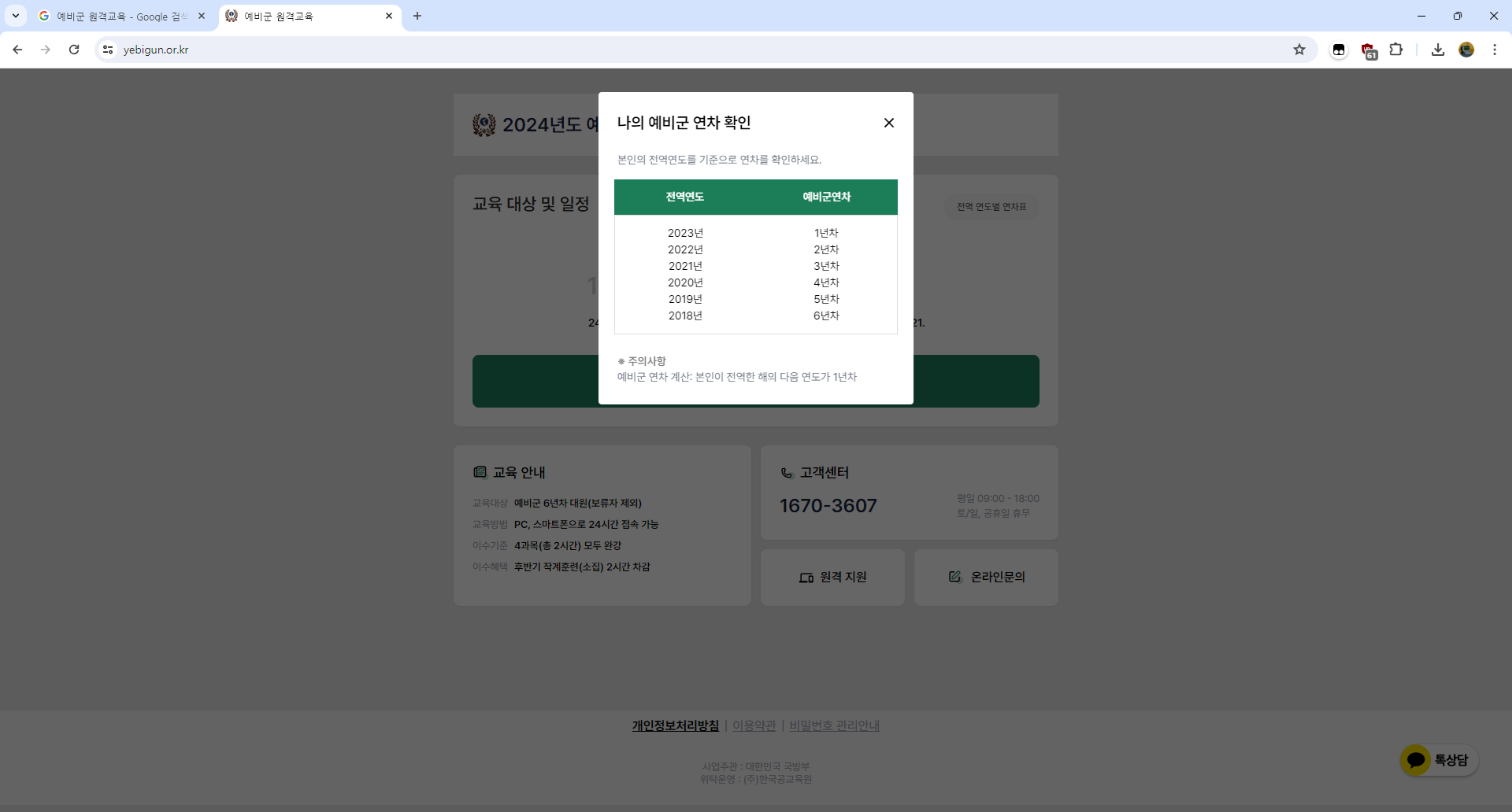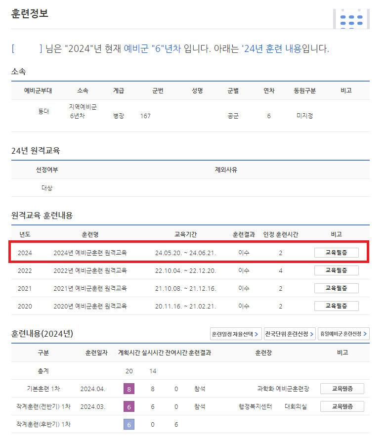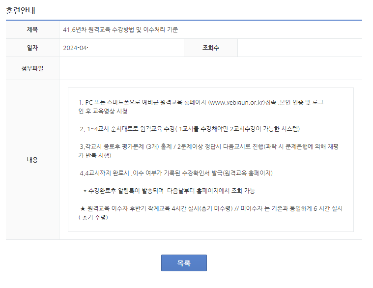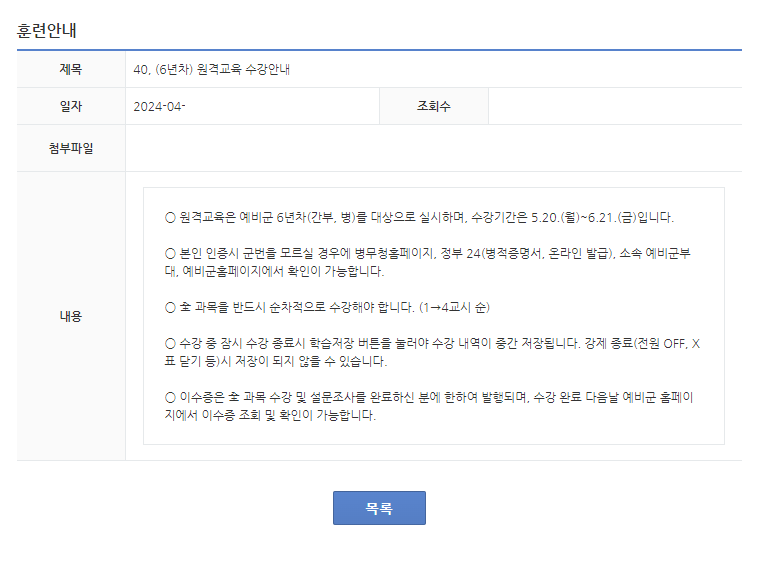 수강 대상은 24년 기준 6년 차 예비군만 대상이 되며 2024년 5월 20일부터 2024년 6월 21일까지 진행됩니다.