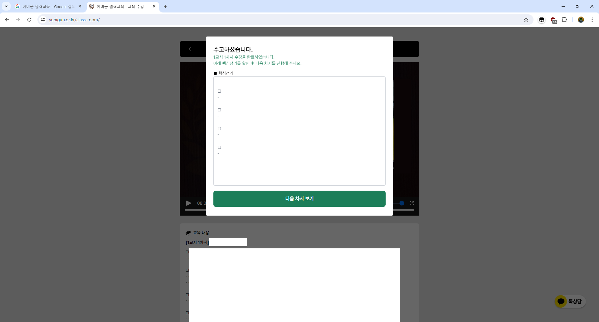 교육 차시가 종료되면 핵심정리로 영상 내용을 요약한 부분이 있으며 다음 차시 보기 버튼을 눌러 진행이 가능합니다.