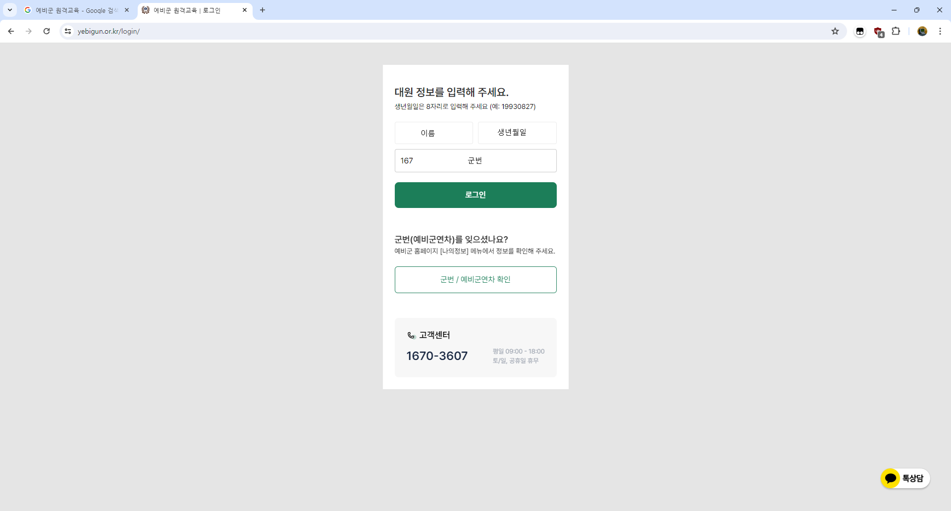 이름 생년월일 군번을 입력하고 로그인을 진행합니다. 군번을 잊은 경우 예비군 홈페이지를 통해 확인이 가능합니다.