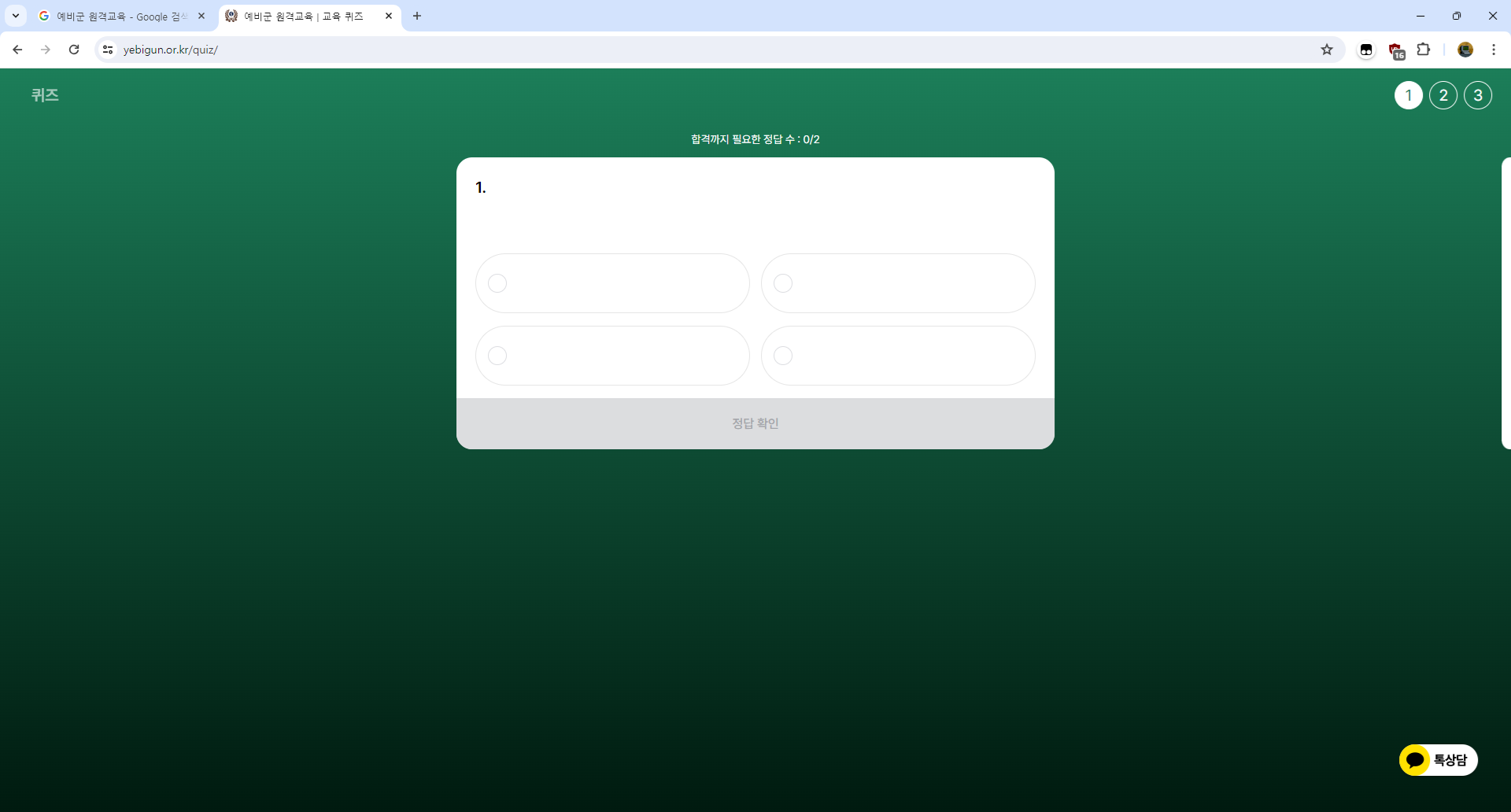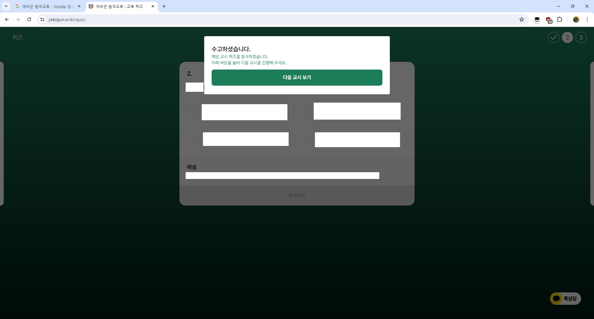 문제의 답을 지정하면 그에 대한 해설이 등장하며 2문제를 맞히면 다음 교시 보기 버튼으로 다음 교시로 넘어갈 수 있습니다. 만약 오답을 지정한 경우라도 계속해서 문제가 등장하고 점수를 부여하지 않으며 총 2문제를 맞힐 때까지 진행됩니다. 문제 난이도는 그렇게 높지는 않았습니다.