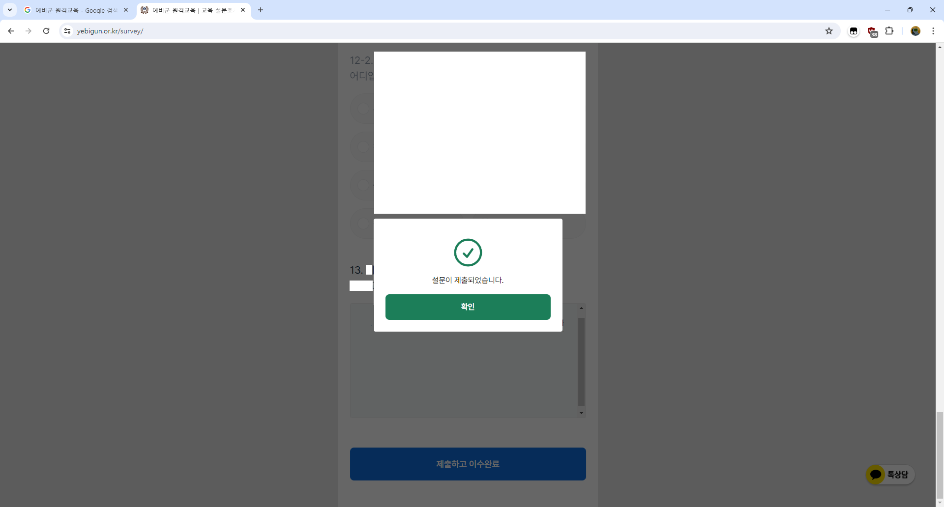 설문은 총 13문항으로 되어있으며 입력 후 아래의 제출하고 이수완료 버튼을 눌러 설문을 제출합니다.