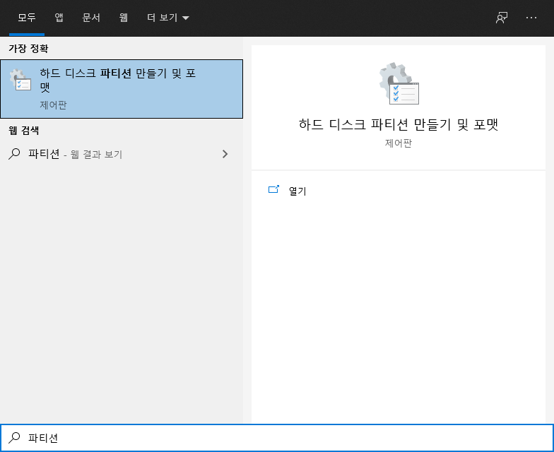 윈도우 10 기준으로 작업표시줄에서 맨 왼쪽에 위치한 시작 버튼에서 오른쪽에 위치한 검색창에서 파티션을 검색하면 하드 디스크 파티션 만들기 및 포맷 항목이 검색이 됩니다. 검색이 되면 이를 실행시켜줍니다.