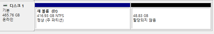 SSD나 하드디스크를 새로 장착하였다면 위와 같이 검은색으로 할당되지 않음으로 되어있는 부분이 있을 것입니다. 저는 이미 사용 중이어서 용량을 축소한 뒤 진행하였습니다. 축소하는 부분은 뒤에 후술 하겠습니다. 여기서 검은색 부분에 오른쪽 마우스 버튼을 눌러 새 단순 볼륨을 선택합니다.