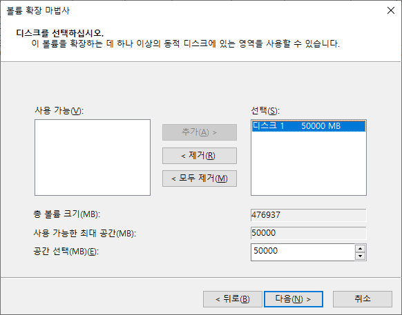 그러면 볼륨 확장 마법사가 실행되게 되는데 여기서 다음 버튼을 눌러 진행합니다. 그 이후에 사용 가능한 부분을 선택하고 용량을 지정한 다음 마침 버튼을 눌러서 종료하시면 됩니다.