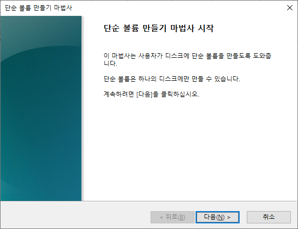 마법사 시작 부분에서 다음 버튼을 누르게 되면 파티션 크기를 지정하게 됩니다. 요즘은 굳이 파티션을 나눠서 사용할 이유가 없으므로 최대치를 지정하고(기본값으로 최대치로 되어있음) 다음 버튼을 눌러줍니다. 드라이버 문자 할당은 사용하지 않는 원하는 문자를 선택하시면 되고 기본값으로는 윈도우가 C에 설치되었다면 D부터 진행 됩니다. 그다음 간단한 포맷 작업(초기화)을 진행하고 마침 버튼을 눌러줍니다.