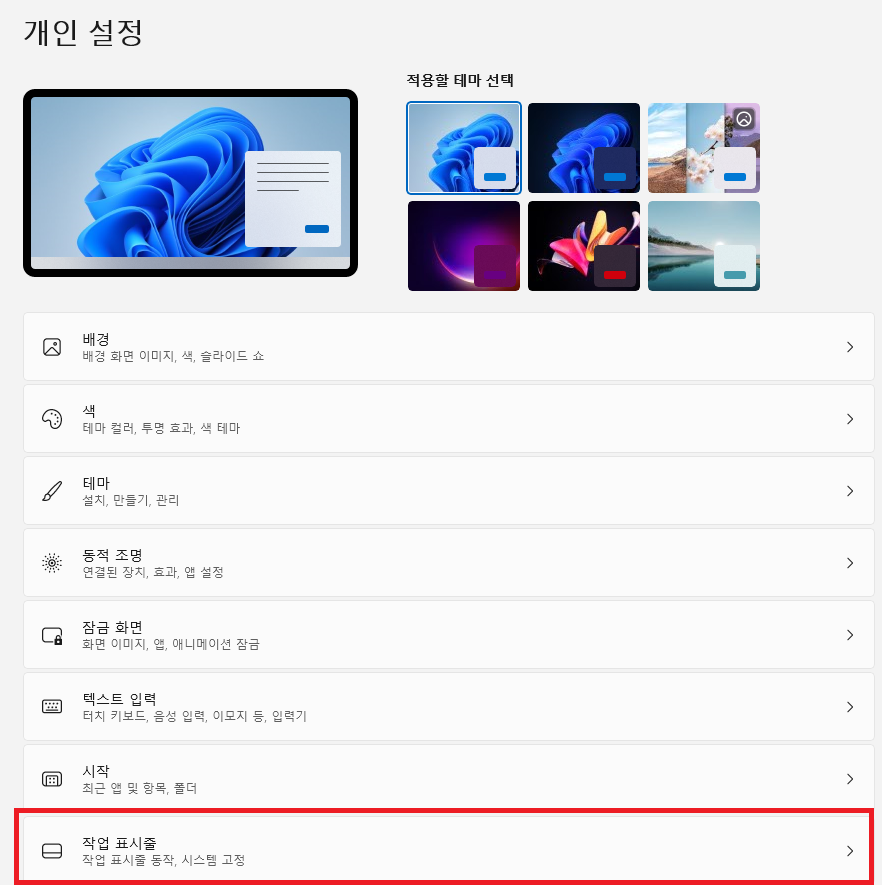 '설정' → '개인설정' → '작업표시줄'로 들어가거나 아래 작업표시줄에서 오른쪽 마우스 클릭 후 '작업표시줄 설정'을 눌러 들어갑니다.