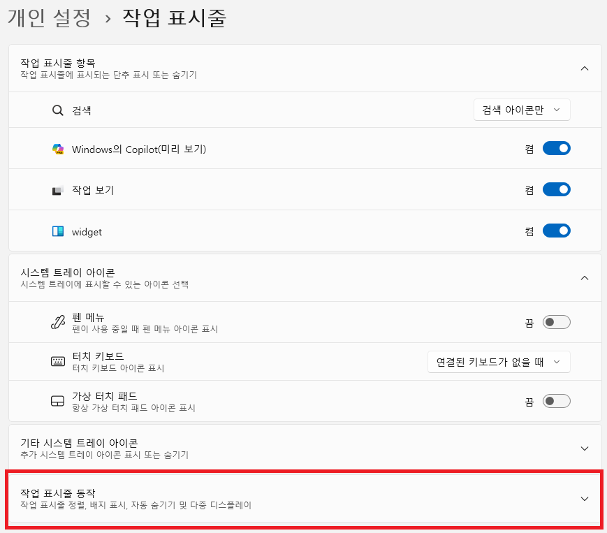 작업표시줄 탭으로 들어가면 아래의 '작업표시줄 동작'을 눌러 드롭다운 메뉴를 활성화합니다.