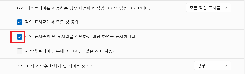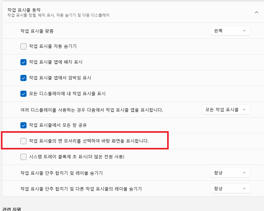 '작업 표시줄의 맨 모서리를 선택하여 바탕 화면을 표시합니다.'를 체크하여 활성화합니다.
