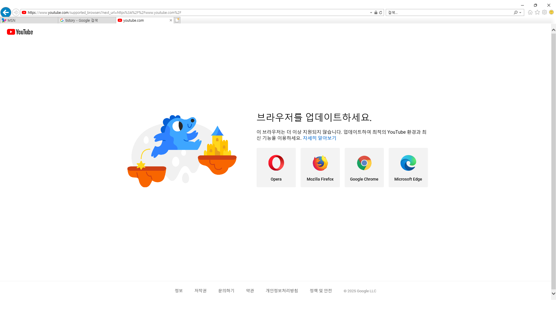 안타깝게도 유튜브도 다른 브라우저인 오페라, 파이어폭스, 크롬, 엣지를 다운로드할 수 있도록 안내페이지로 넘어가게 되어있습니다.