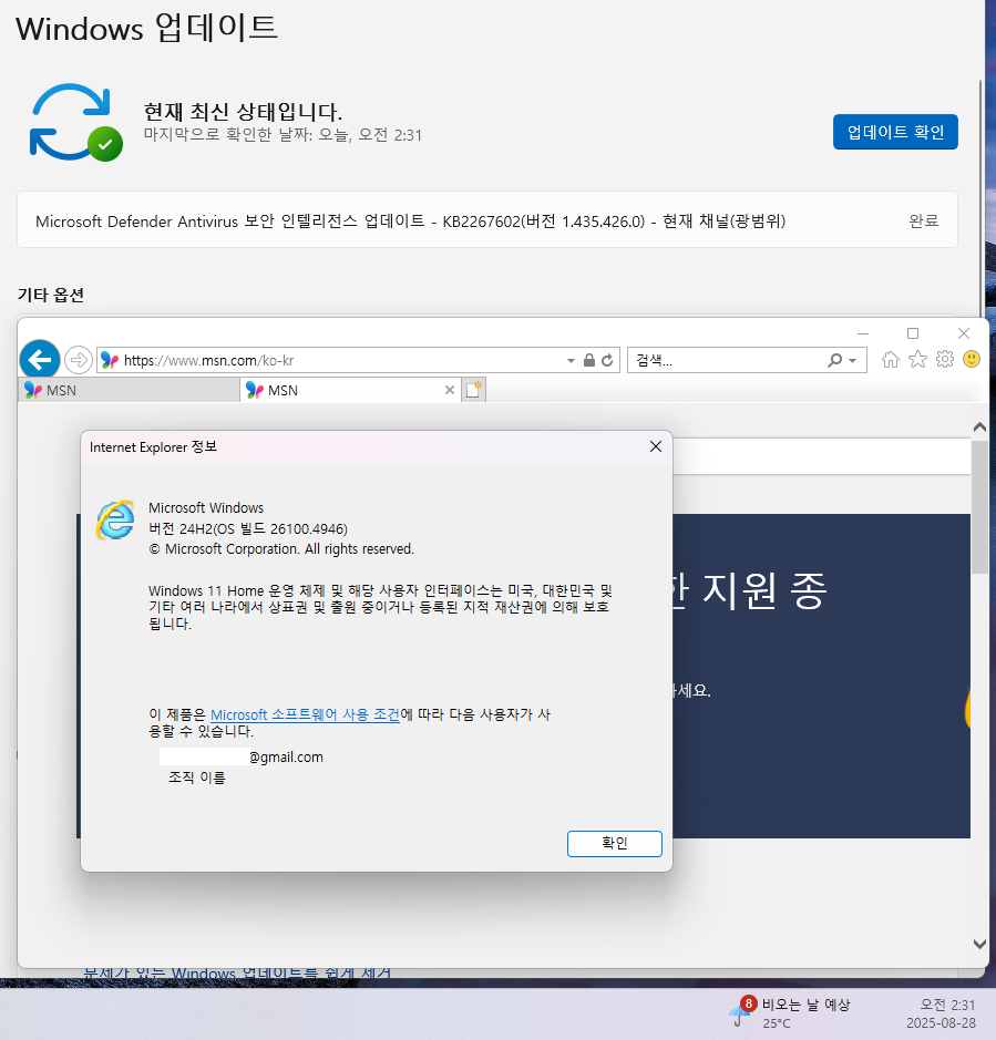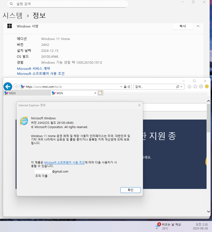또한 2022년 6월 15일에 자체 실행이 막혔지만 윈도우 11 24H2 업데이트가 적용되어 있는 2025년 8월 28 임에도 불구하고 여전히 실행 가능한 것을 확인할 수 있었습니다. 다만 인터넷 익스플로러 정보 보기 화면이지만 정보가 업데이트되는 것을 보아 인터넷 익스플로러 자체 정보가 아닌 그냥 윈도우 정보가 노출되는 것으로 추정됩니다.