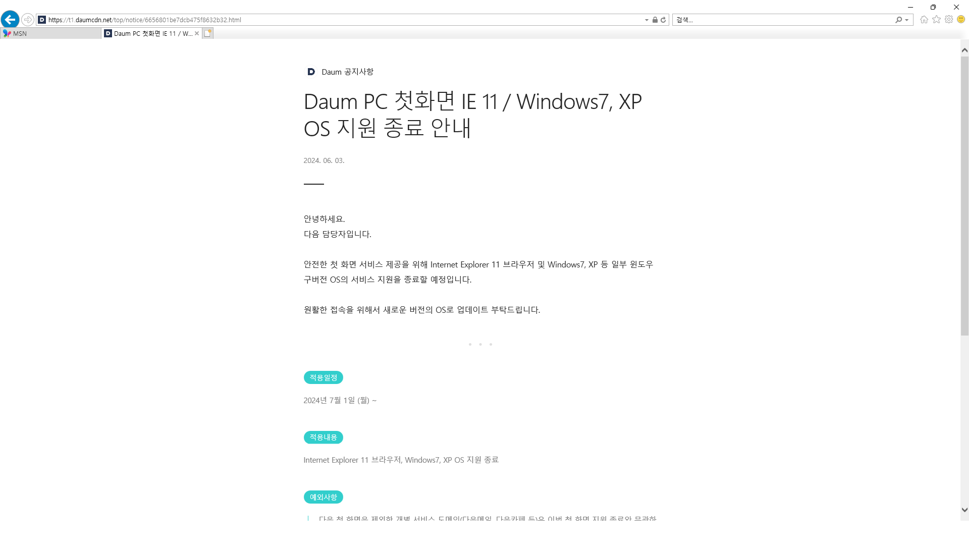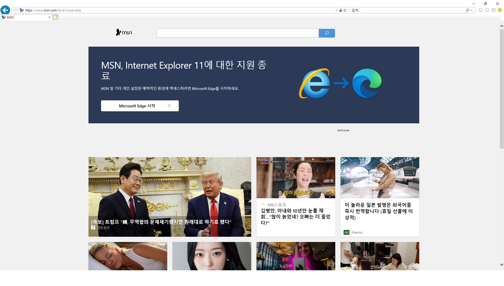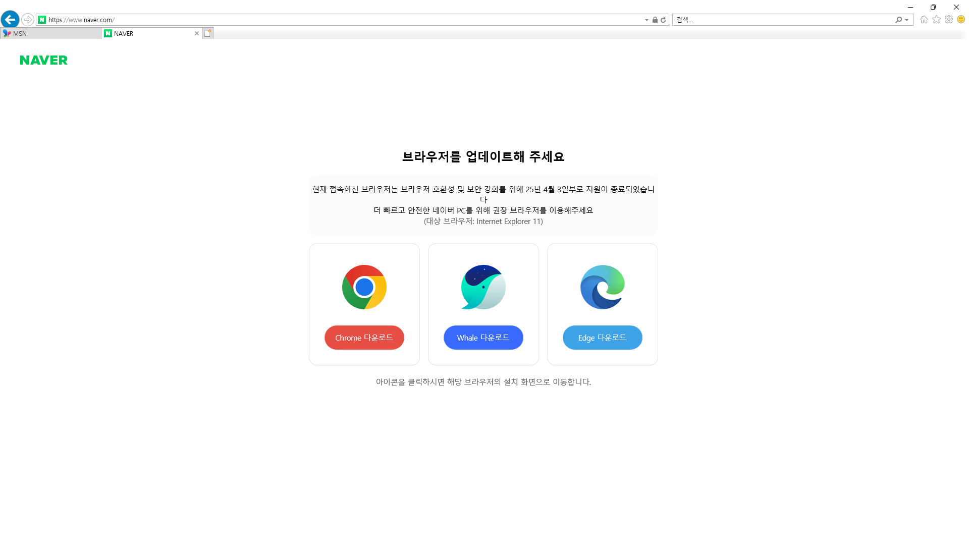 MSN에서는 인터넷 익스플로러가 종료되었으니 마이크로소프트 엣지를 설치할 것을 요구하는 페이지가 뜨게 됩니다.