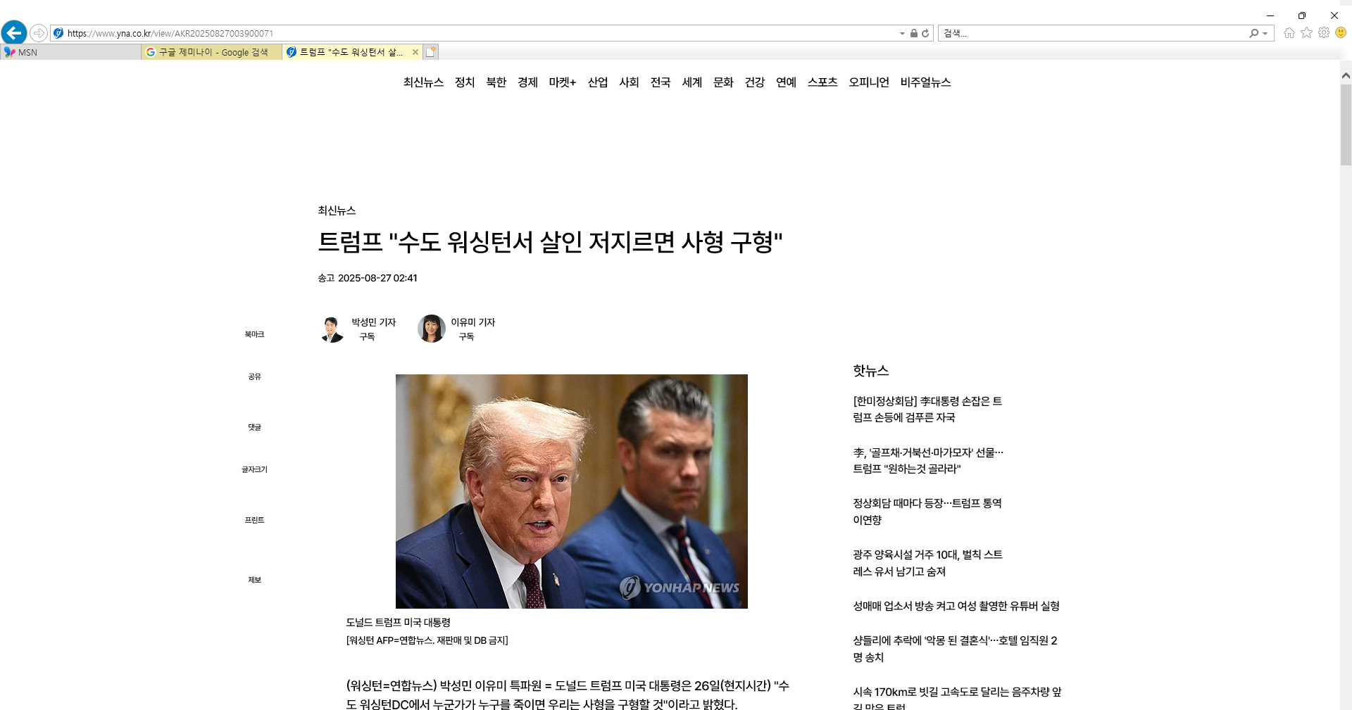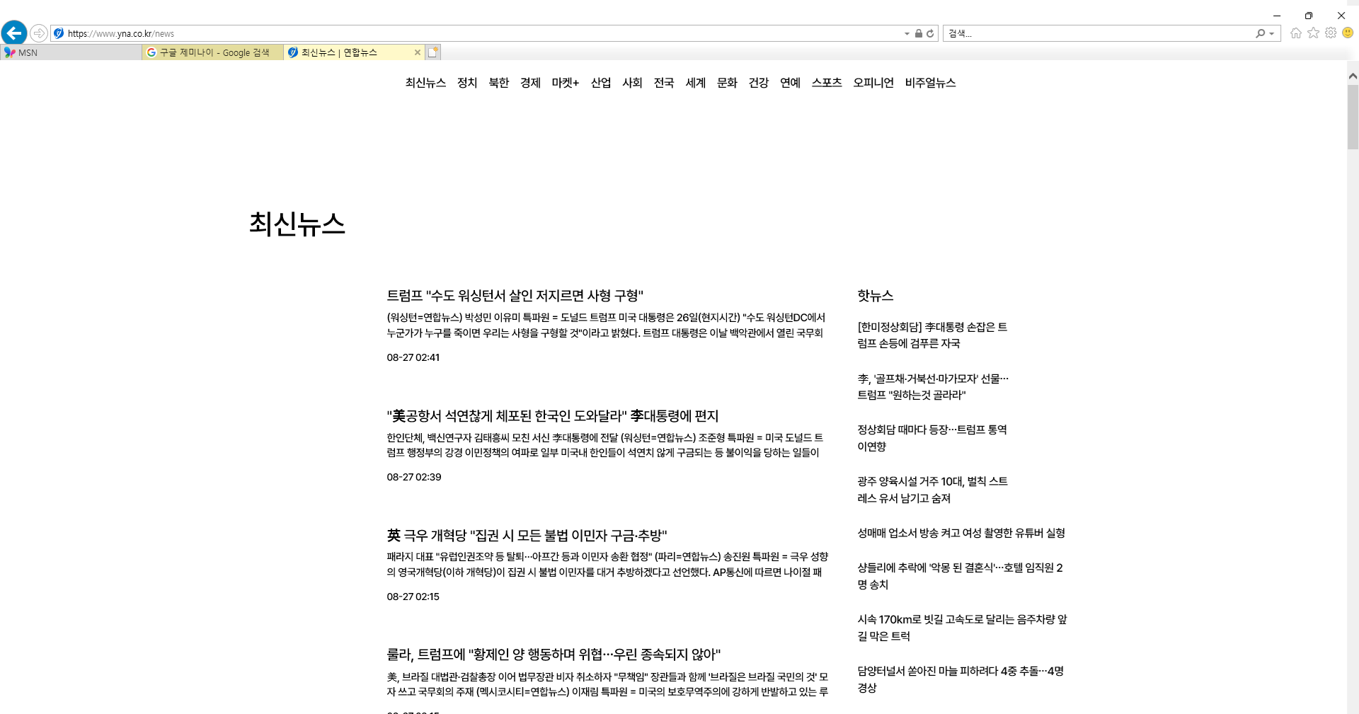 연합뉴스 최신뉴스 부분입니다. 실시간 뉴스가 갱신되는 모습을 확인할 수 있었습니다.