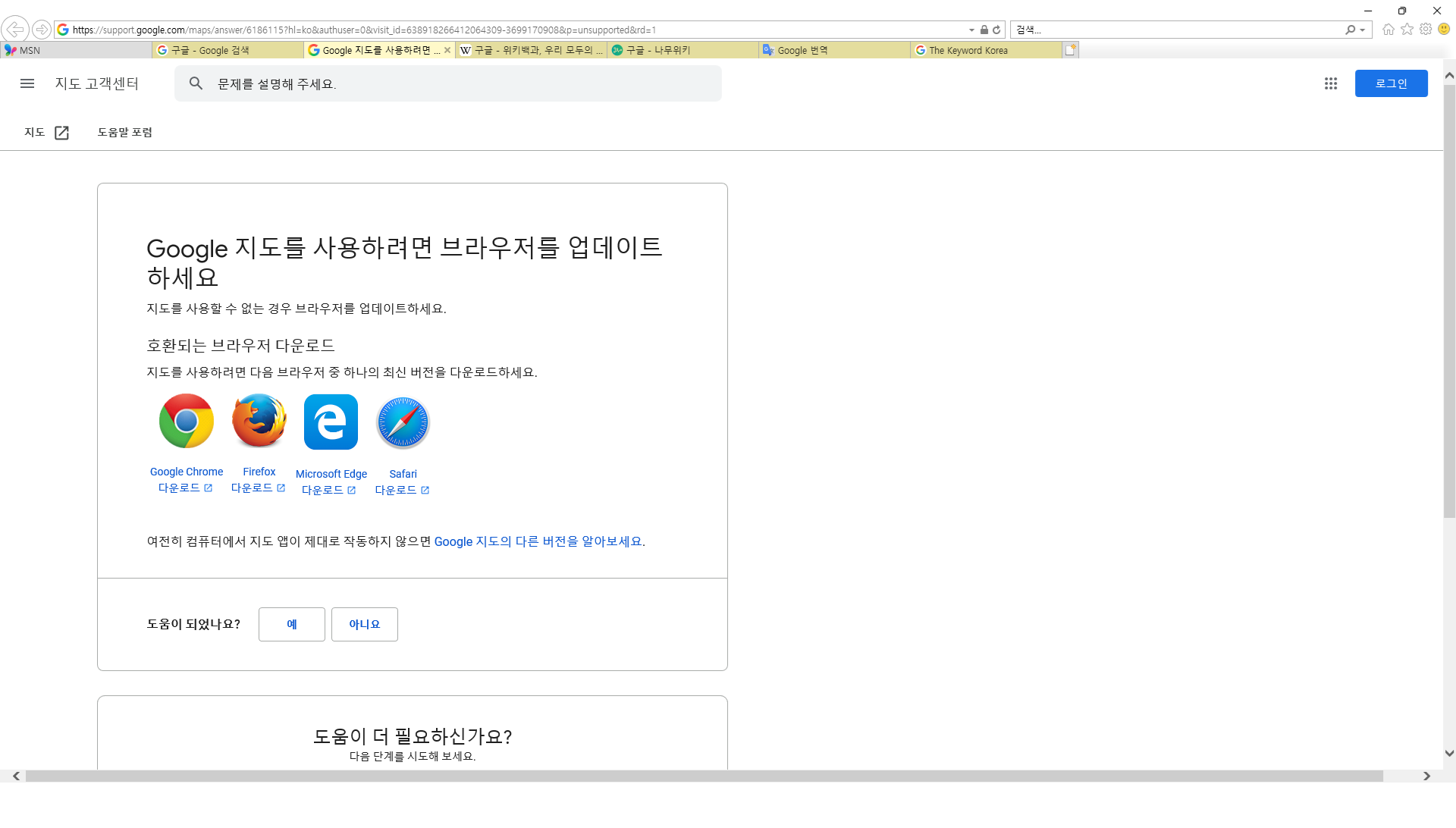 우선 구글지도는 크롬, 파이어폭스, 엣지, 사파리와 같은 브라우저로 업데이트를 하도록 고객센터 페이지로 넘어가서 정상 활동은 불가능했습니다.
