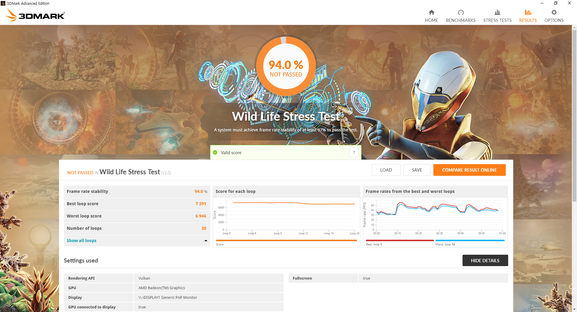 결과로는 다음과 같이 나왔습니다. GPU 점수는 20번 루프를 돌리는 특성상 최고 점수와 최저점수가 같이 나왔습니다. 그리고 AMD CPU가 르누아르 시리즈인 만큼 내장 그래픽을 가지고 있어 내장 그래픽인 라데온 그래픽도 같이 익스트림으로 테스트를 사용하여 벤치를 진행하려고 하였지만 vram부족인지는 모르지만 내용을 불러오는데 실패하여 한 단계 낮은 노말 모드로 스트레스 테스트를 진행하였습니다.
