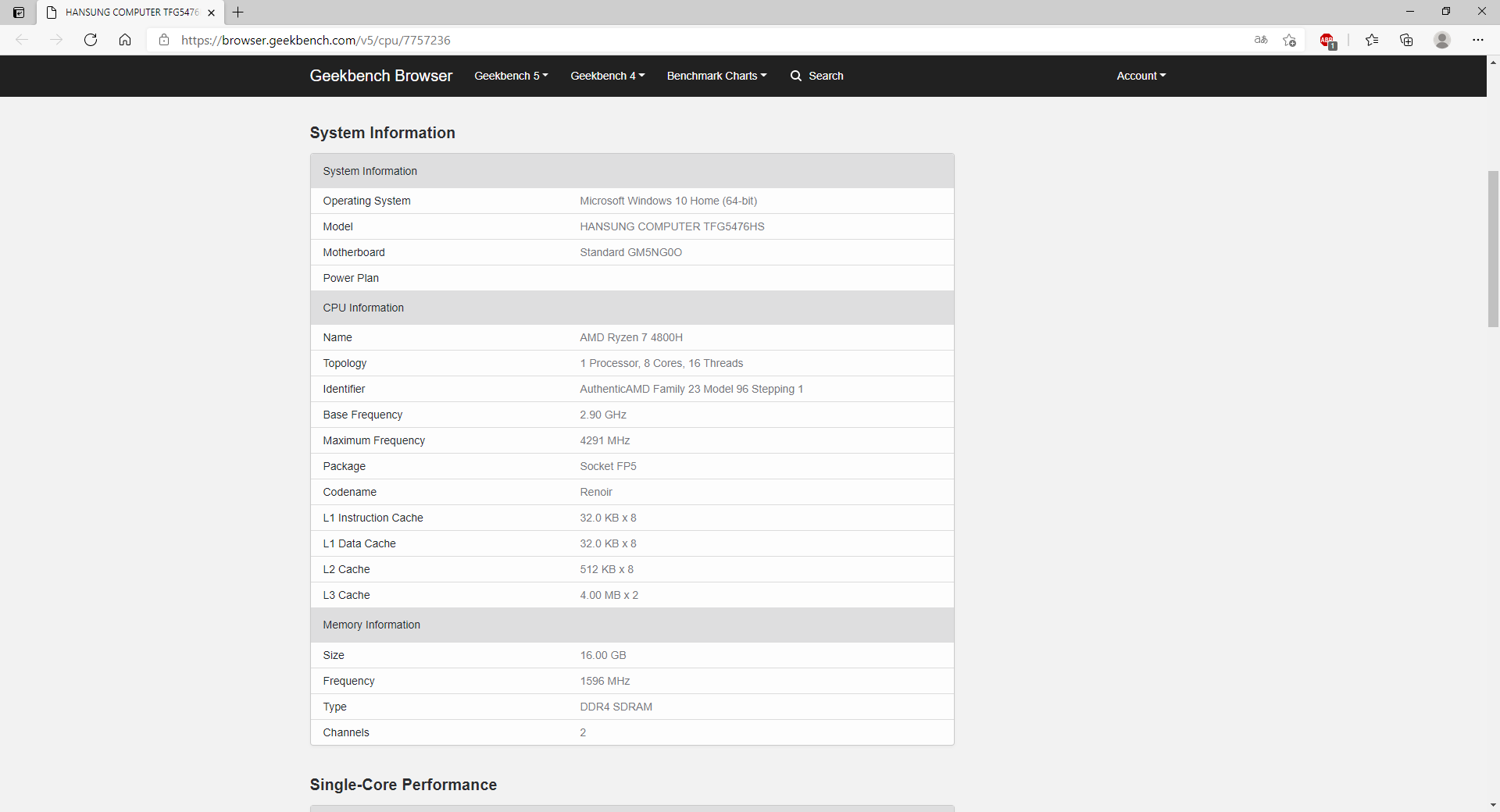 라이젠 7 4800H(르누아르)의 코어 구조는 다음과 같습니다.