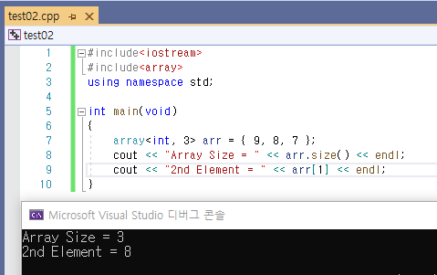 위와 같은 방식은 기존의 C언어에서 주로 사용하던 것으로 C++에서도 호환성을 위해 그대로 지원을 하지만 std::array라는 고정 크기 컨테이너를 대신하여 사용합니다. 이 타입은 <array> 헤더 파일에 정의가 되어있어 사용하려면 해당 헤더 파일을 인클루드를 해야 합니다.