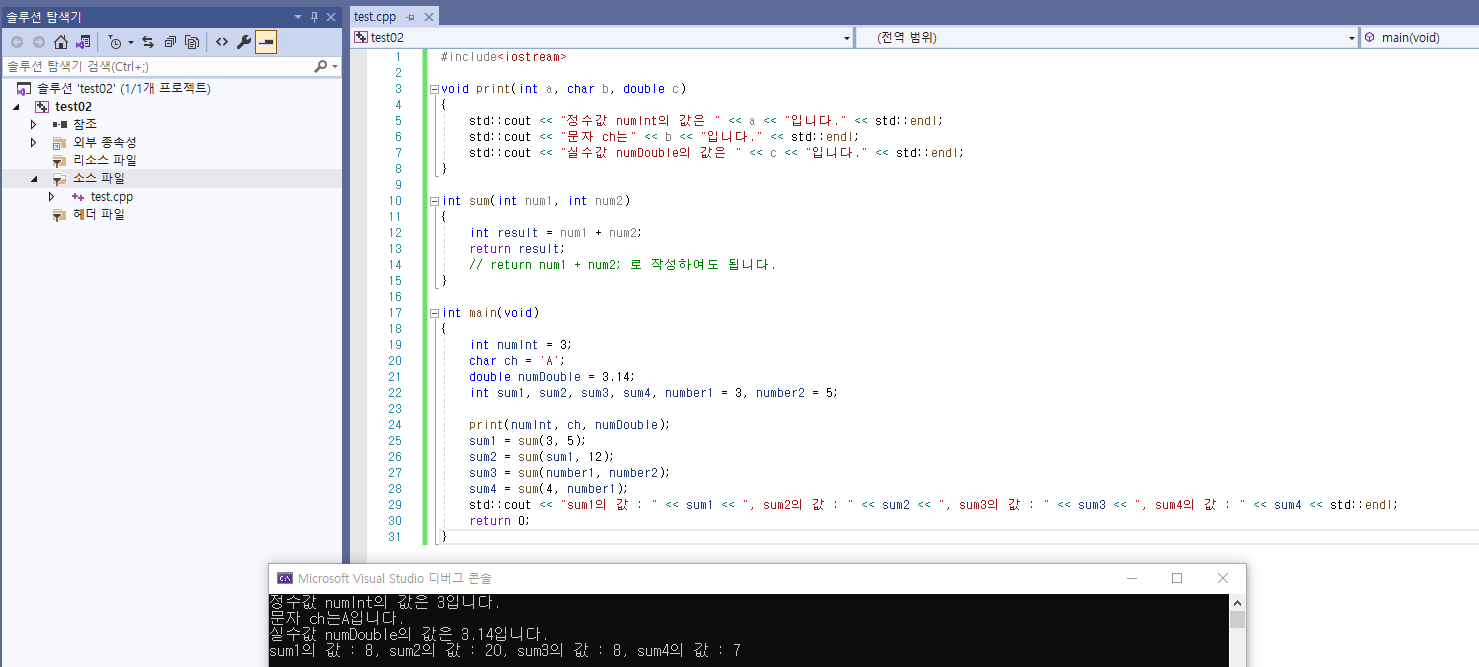 다만 이처럼 동작을 구현하지 않는다면 링크 과정에서 에러가 발생하게 됩니다. 이 부분을 앞에 쓰고 사용할 위치 뒤에 다시 재정의 하는 방식도 있긴 하지만 사용하는 부분이 보통 main에서 사용하므로 main을 맨 마지막에 작성하는 것이 권장됩니다. 그러므로 일반적으로 정의하는 방식은 다음과 같습니다.