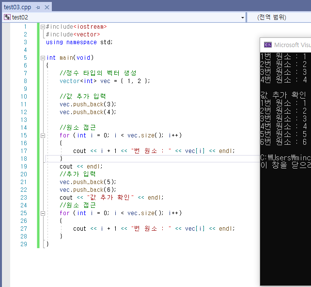 cout << i + 1 << "번 원소 : " << vec[i] << endl;