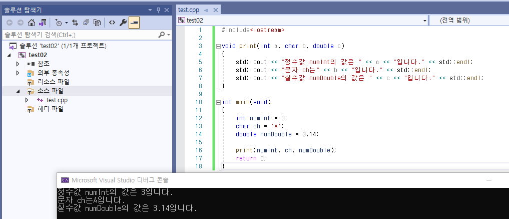 여기서 리턴 타입을 void로 지정하면 return을 사용하지 않고 마찬가지로 호출할 때도 함수와 매개 변수만 입력하면 됩니다. 매개변수에서도 위의 예시처럼 int 이외의 다른 자료형을 사용할 수 있습니다.