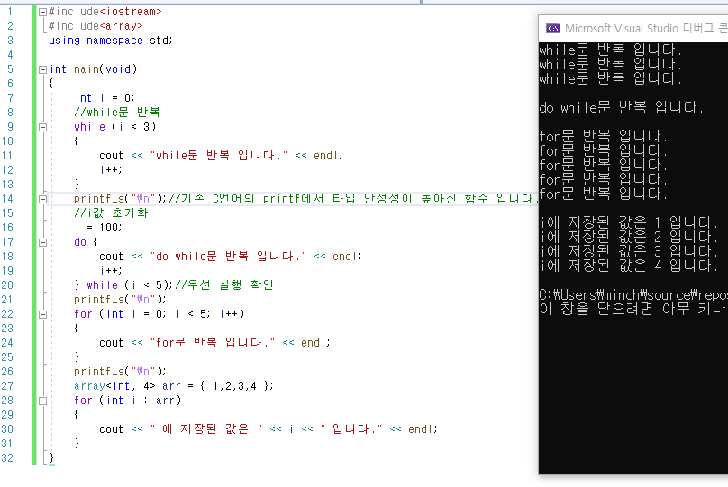 반복문은 같은 내용을 반복하기 위해 사용하는 것으로 C++에서는 while, do-while, for, 범위 기반 for 등 4가지를 사용합니다.