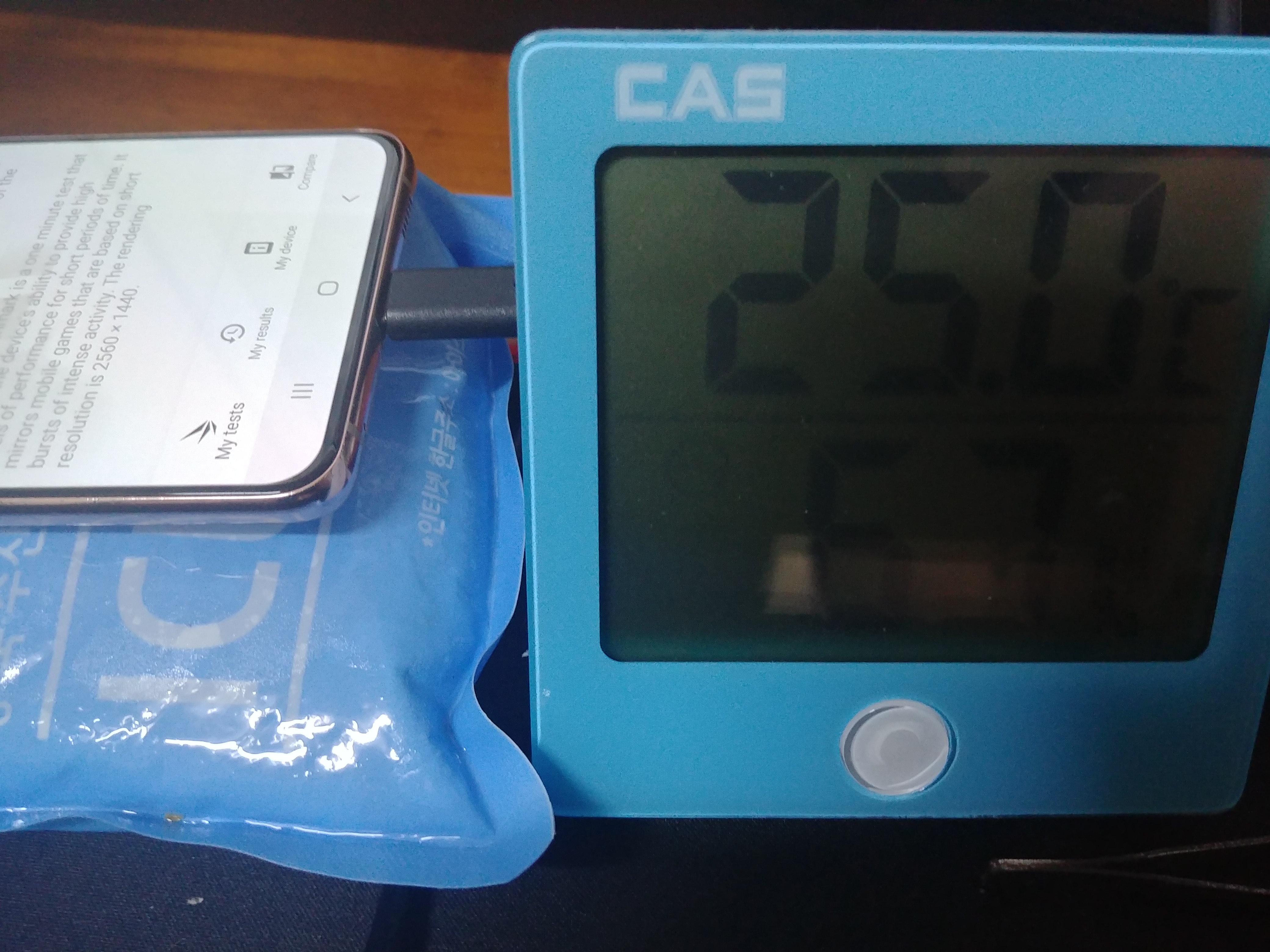 기존과 다른 테스트 세팅으로는 기기의 위와 아래에 냉동실에서 영하 18도로 한 달 이상 얼리고 막 꺼내온 아이스팩을 배치하고 옆에 선풍기를 설치한 다음 재부팅 후 테스트를 진행하였습니다. 사진으로 찍지는 않았는데 벤치마크 진행 도중에는 회색 아이스팩을 휴대폰 위에 올려놓고 진행하였습니다.