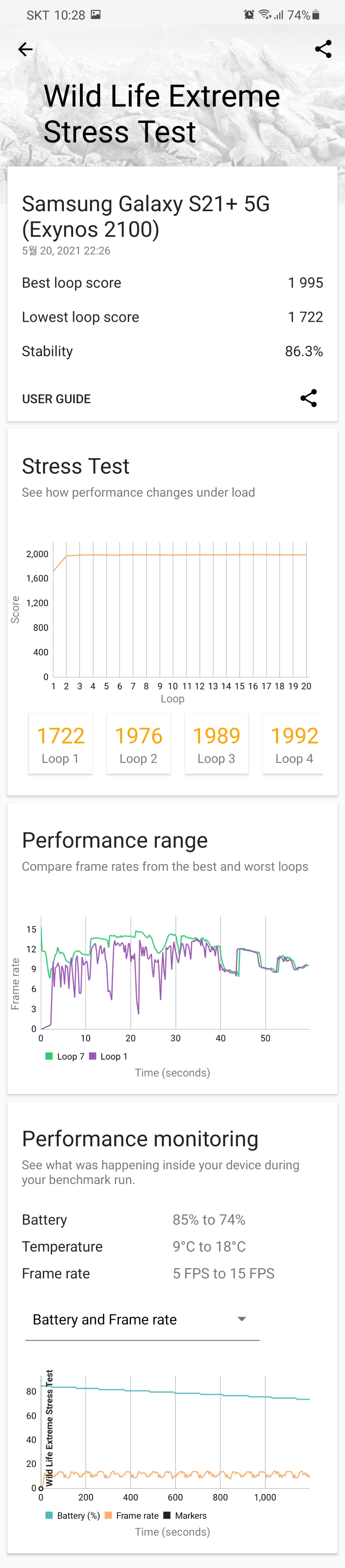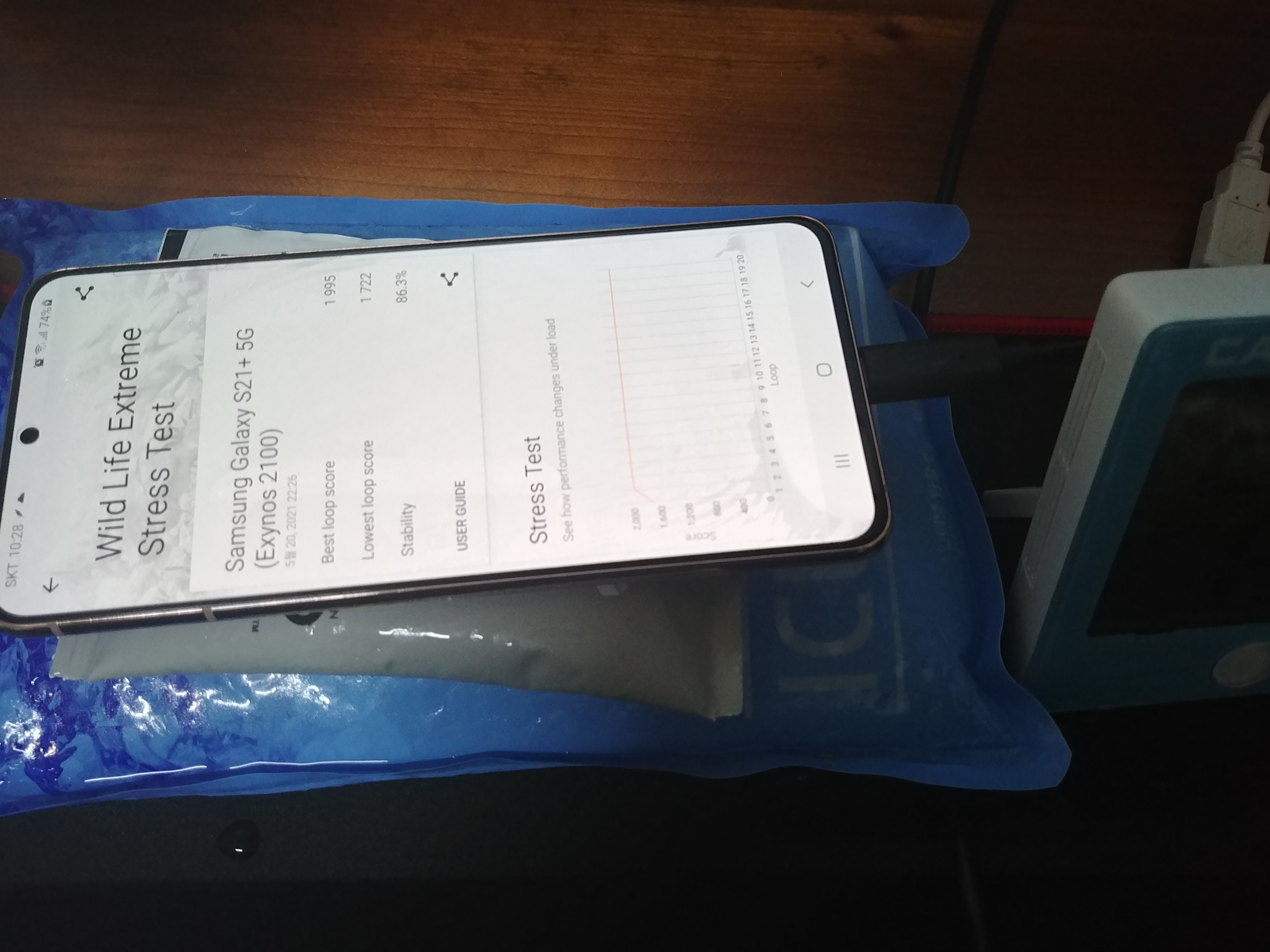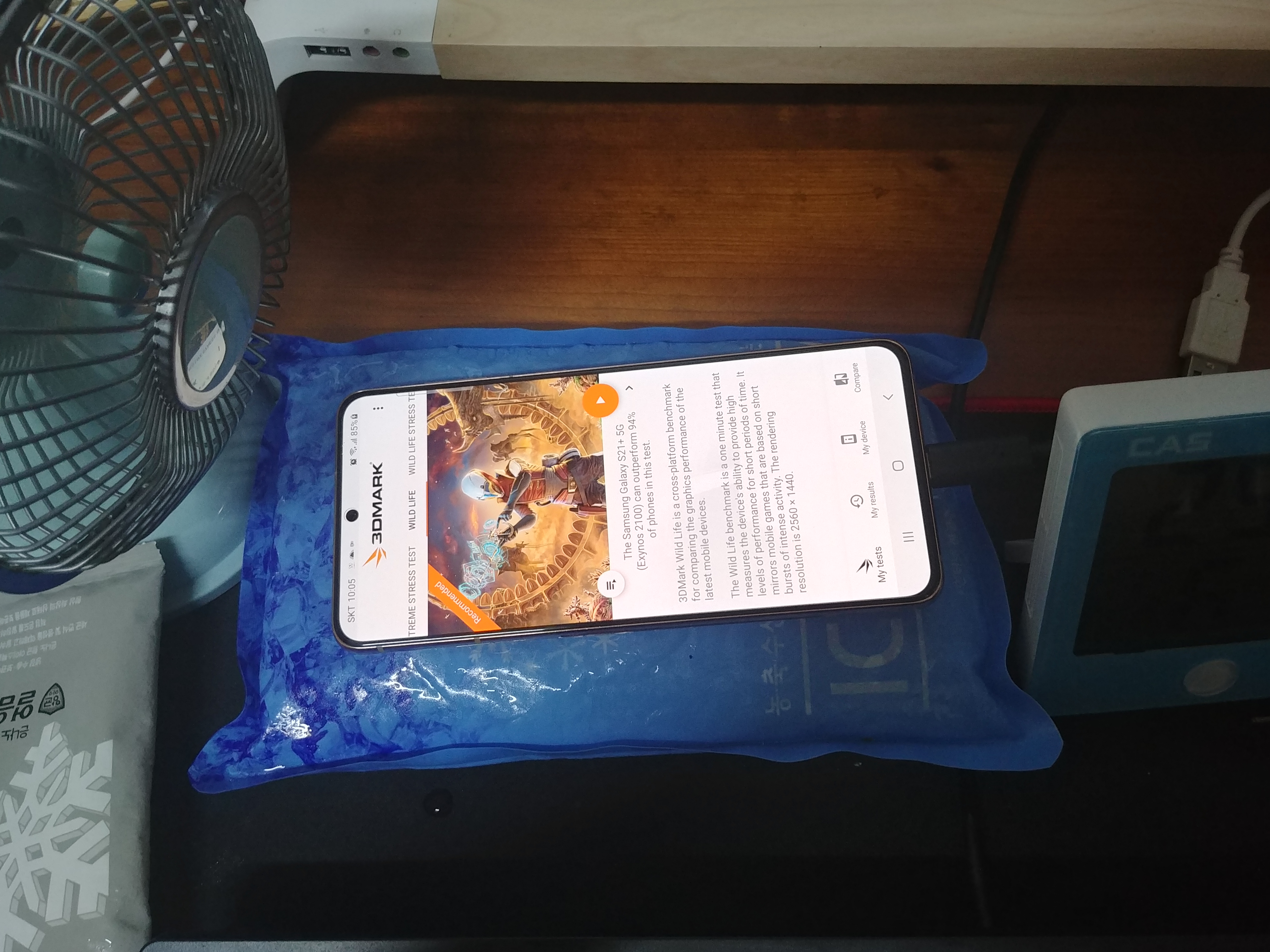 일반적으로 기기의 성능을 하락시키는 주원인 중 하나로 쓰로틀링 현상이 있습니다. 쓰로틀링 현상이란 기계의 온도가 어느 시점까지 올라가게 되면 기계의 회로 보호 등의 이유로 발열을 제어하여 성능을 낮추는 현상을 의미합니다. 다른 게시글에서도 확인할 수 있다시피 갤럭시 S21시리즈의 경우에는 3DMark로 스트레스 테스트를 진행하면 3번째 혹은 4번째 루프부터 성능이 낮아지는 현상이 관측됩니다. 그렇기 때문에 아이스팩을 이용하게 된다면 계속해서 원래의 성능을 보여줄지 궁금해져서 한번 실험을 진행해 보았습니다.